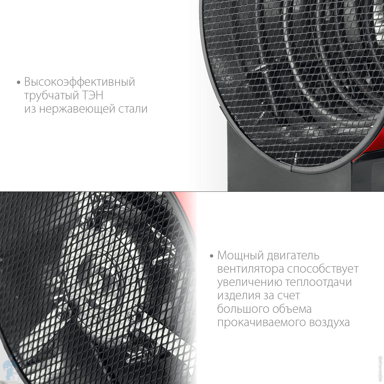 * Мощный двигатель вентилятора способствует увеличению теплоотдачи изделия за счет большого объема прокачиваемого воздуха