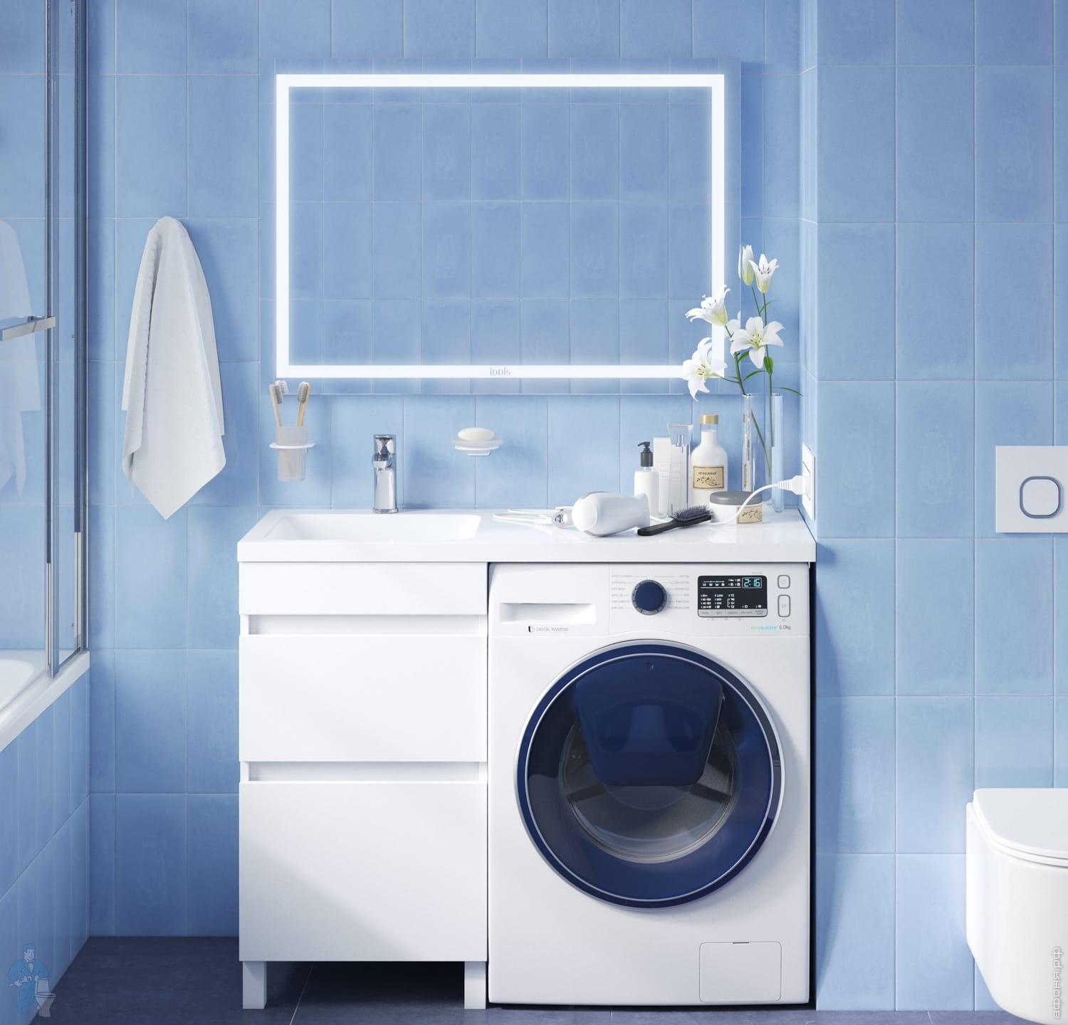 Тумба Optima Home - это удобное решение, чтобы организовать одновременно и зону умывания, и расположить стиральную машину. Модель подходит для установки стиральных машин с фронтальной загрузкой непосредственно под умывальник с длинным крылом (не входит в комплект). Для комплектации тумбы рекомендуется использовать только оригинальную модель умывальника IDDIS из искусственного камня. В коллекции Optima Home представлены варианты для размещения стиральной машины слева (арт. 480110Ri28, не входит в комплект) и справа (арт. 480110Li28, не входит в комплект) от тумбы. Два вместительных ящика обеспечивают удобное хранение бытовой химии и принадлежностей для стирки. Высокие ножки позволяют скрыть коммуникации под тумбой и защитить ее от повреждения при затоплении.