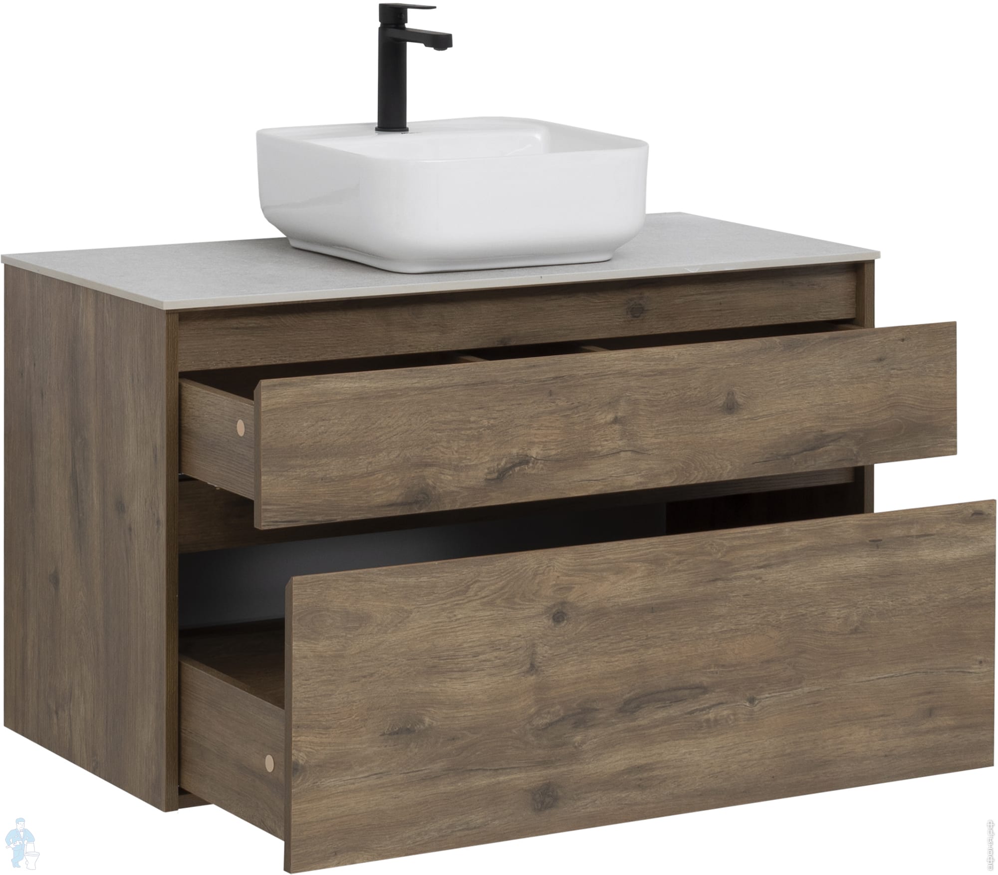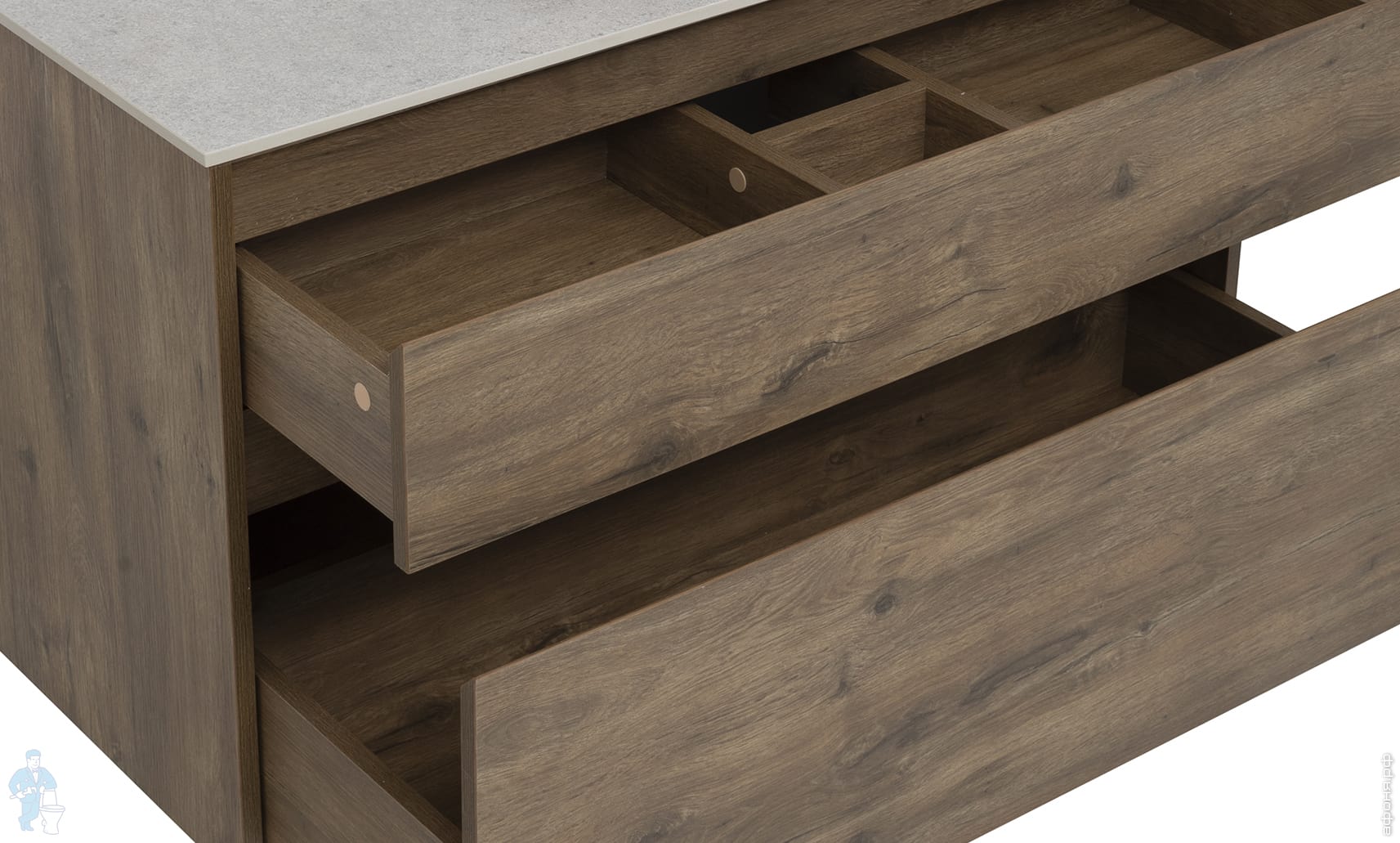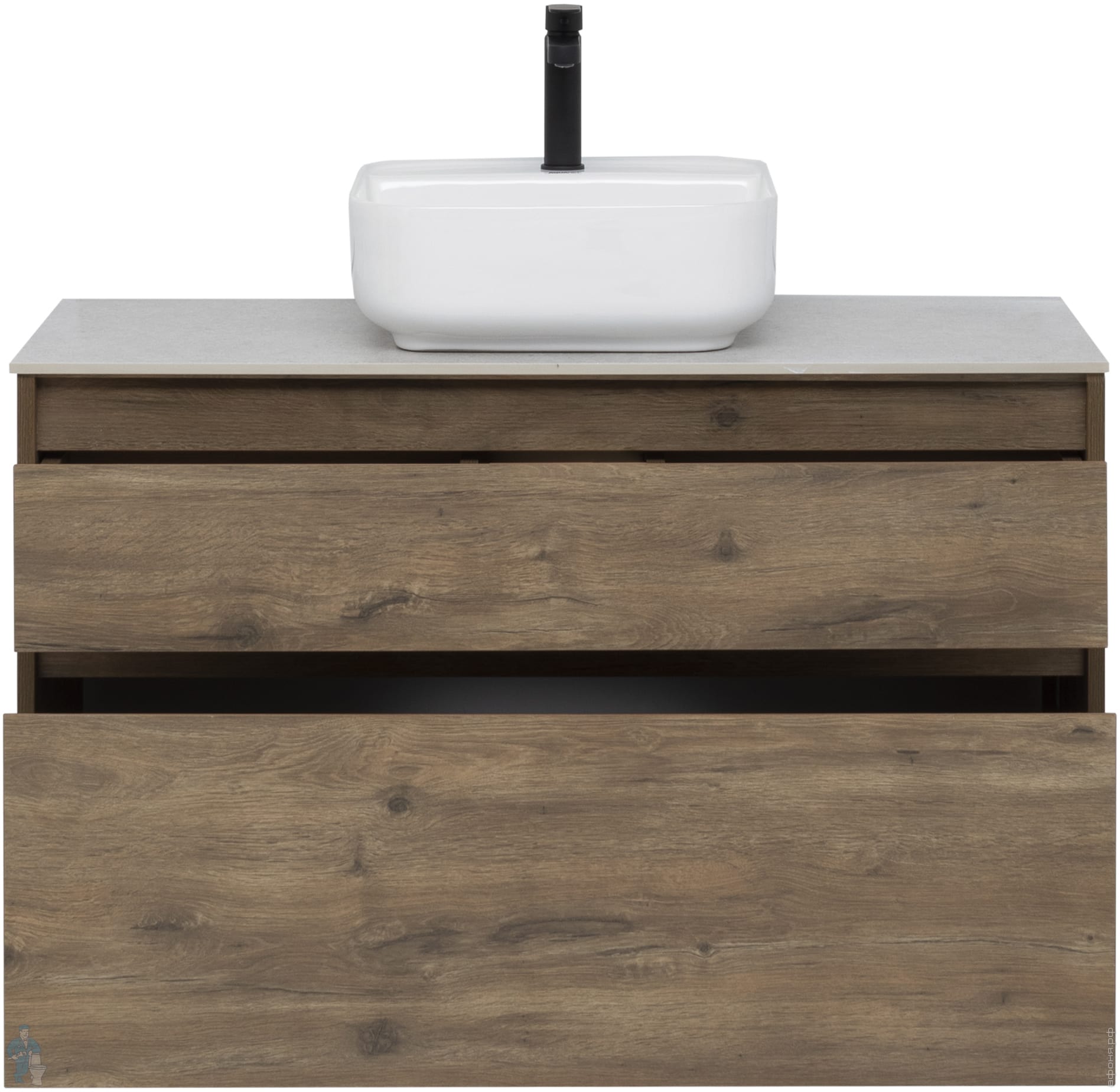 Подвесная тумба под столешницу и накладной умывальник, два выдвижных ящика. Фасады не имеют традиционных ручек, сверху торец срезан под углом для удобства открывания.