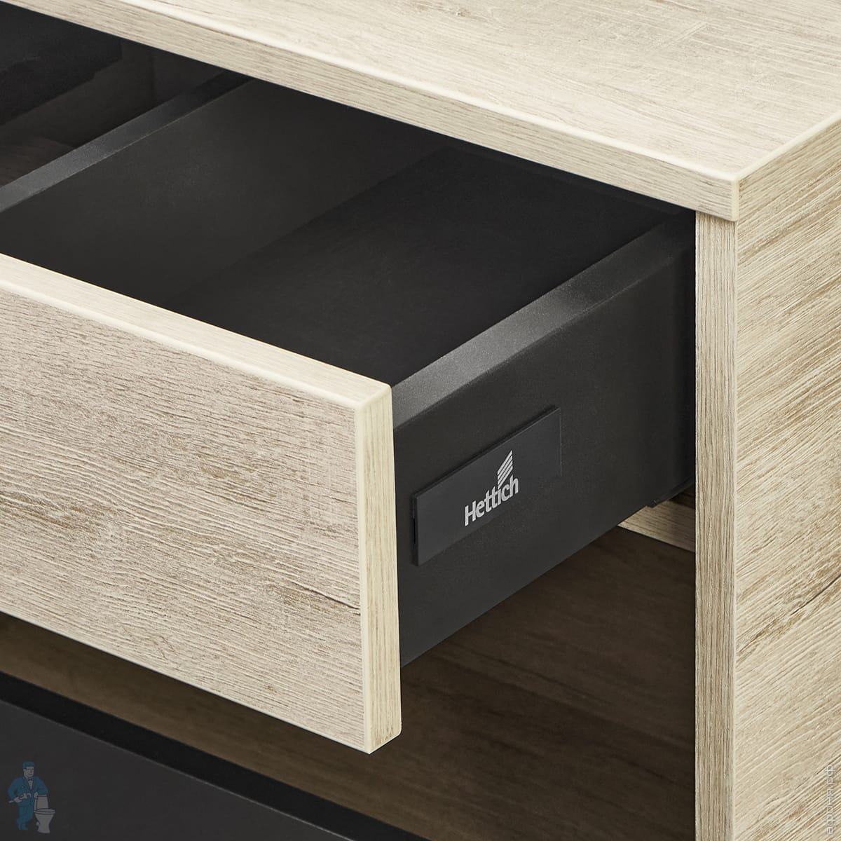 Верхний ящик тумбы комплектуется внутренней организацией пространства: в нем очень удобно хранить небольшие аксессуары и принадлежности. Вместительный нижний высокий ящик подойдет для более крупных предметов.