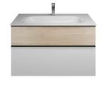 Подвесная тумба с 2 ящиками и умывальником из искусственного камня. Фасад верхнего ящика имеет плиссированную поверхность.