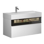 Подвесная тумба с 2 ящиками и LED-подсветкой, расположенной под умывальником. Верхний ящик имеет стеклянный фасад в алюминиевой рамке. Подсветка подключается к общему освещению ванной комнаты. В комплекте умывальник из искусственного камня.