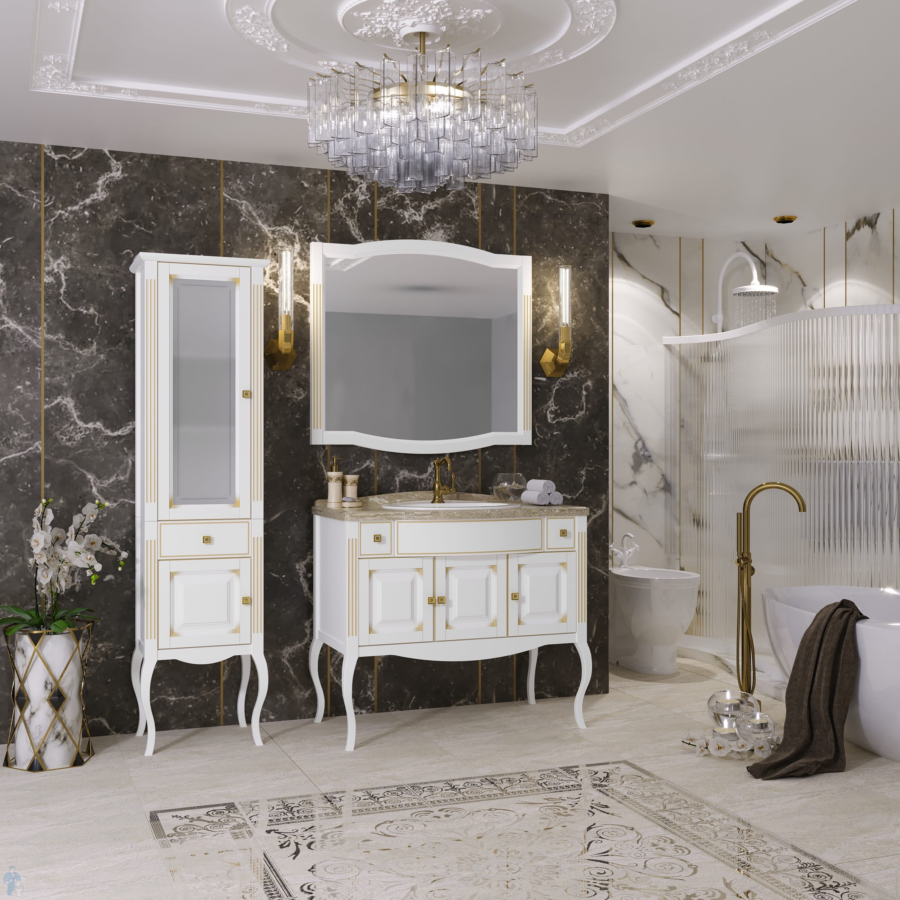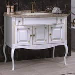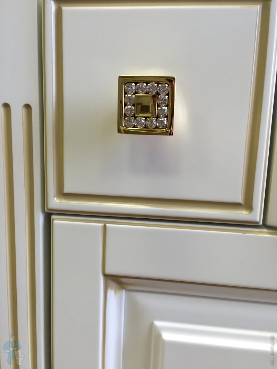 Тумба выполнена в белом матовом цвете, патина вполнена в золотом цвете. Материал - натуральный массив бука. Напольный способ монтажа, фурнитура выполнена в золотом цвете с кристаллами сваровски. Прямоугольной формы. идет в комплекте с опорными ножками