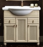 Комплект состоит из тумбы с тремя открывающимися дверцами с декоративной решеткой, двумя выдвижными ящиками и керамической раковины Дрея (Чехия).