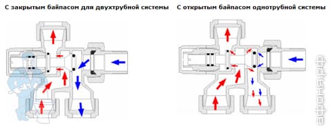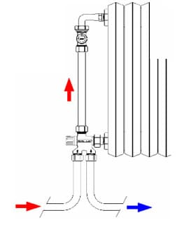 Узел содержит запорный вентиль и байпас. На соединительном трубопроводе (не входит в комплект) устанавливается терморегулирующий вентиль, подключаемый к радиатору через угловой фитинг с накидной гайкой. Для автоматического управления тепловым режимом можно использовать термостатическую головку - арт. 1825.