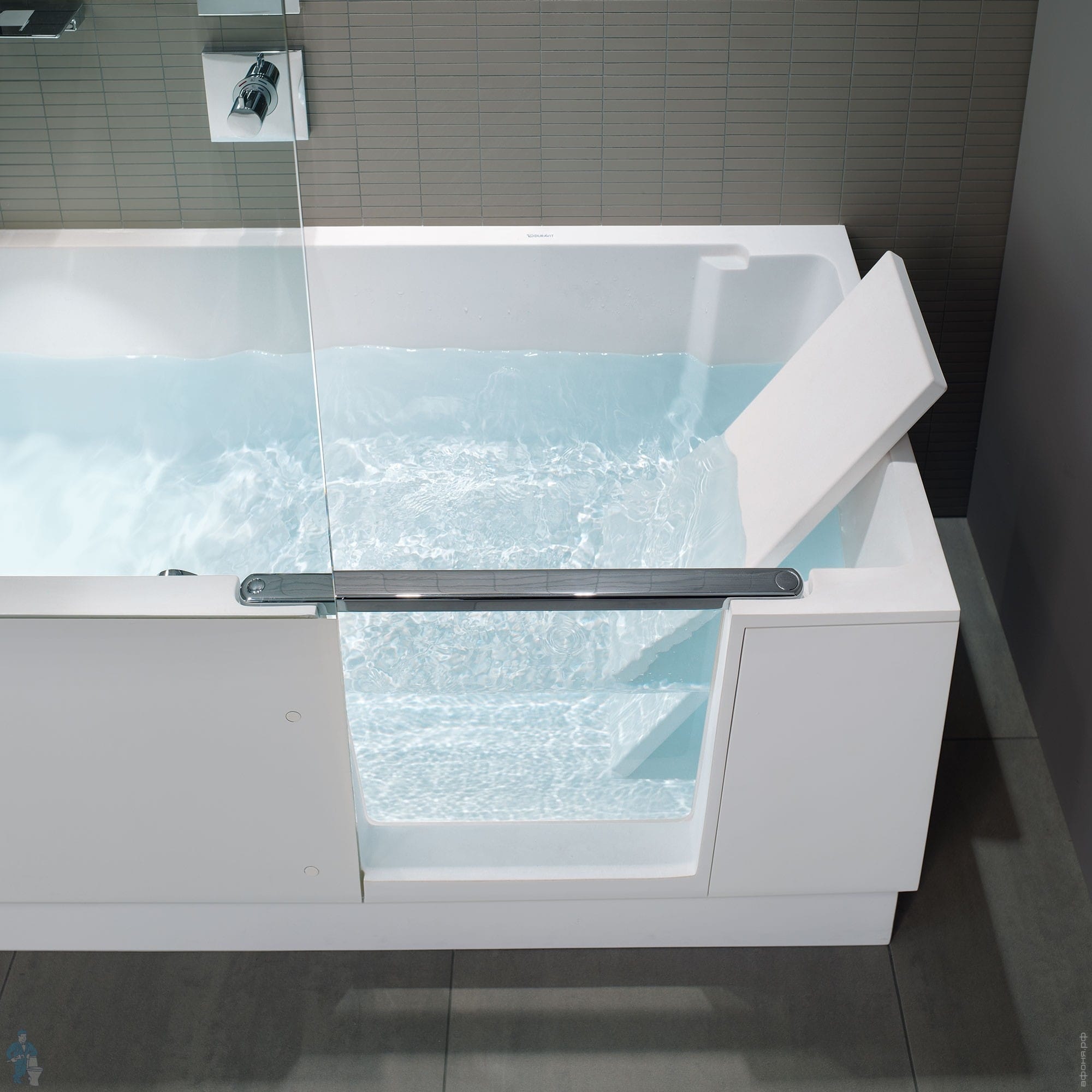 Запираемая дверца из безопасного стекла преображает душ в ванну для релаксации. Механический запор дверцы гарантирует, что дверца не откроется, когда закрыт выпуск.