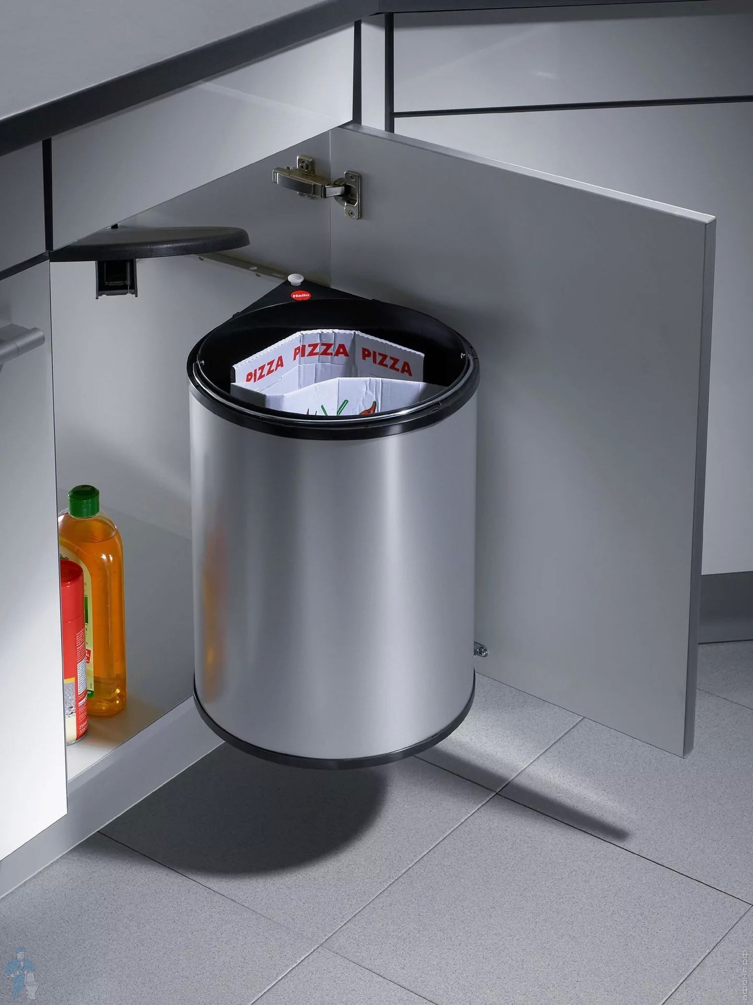 -При закрывании дверцы, ведро возвращается в нишу, крышка плотно прикрывает его