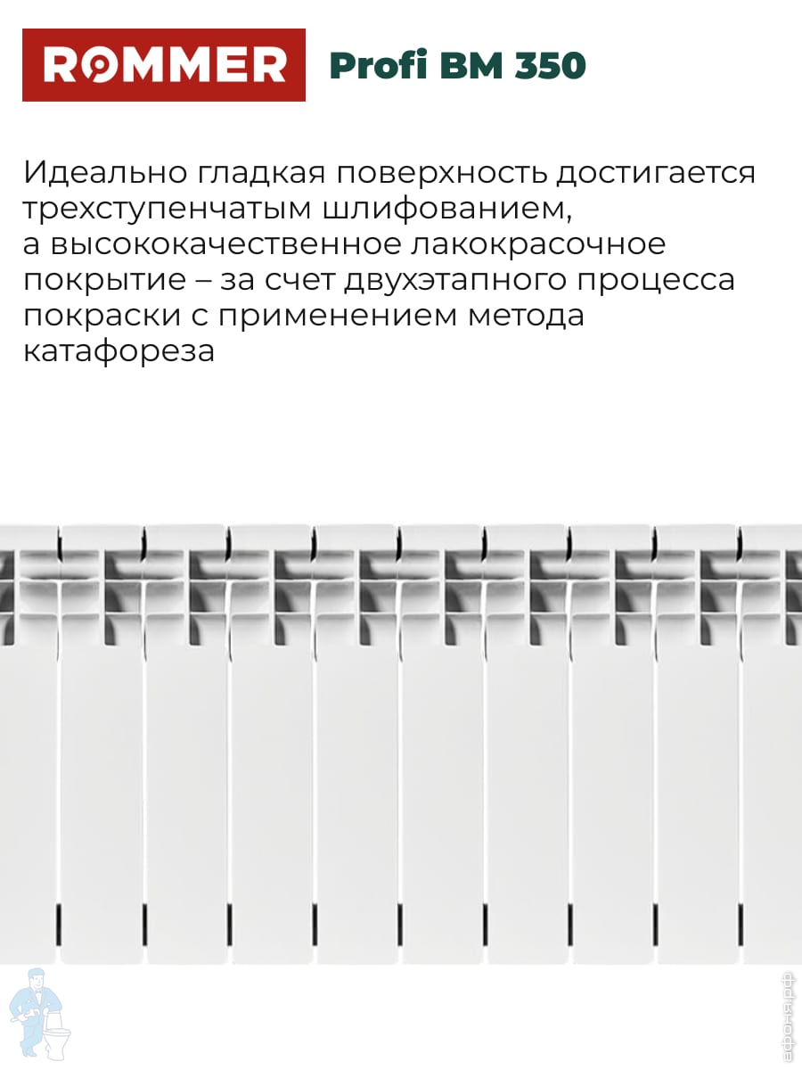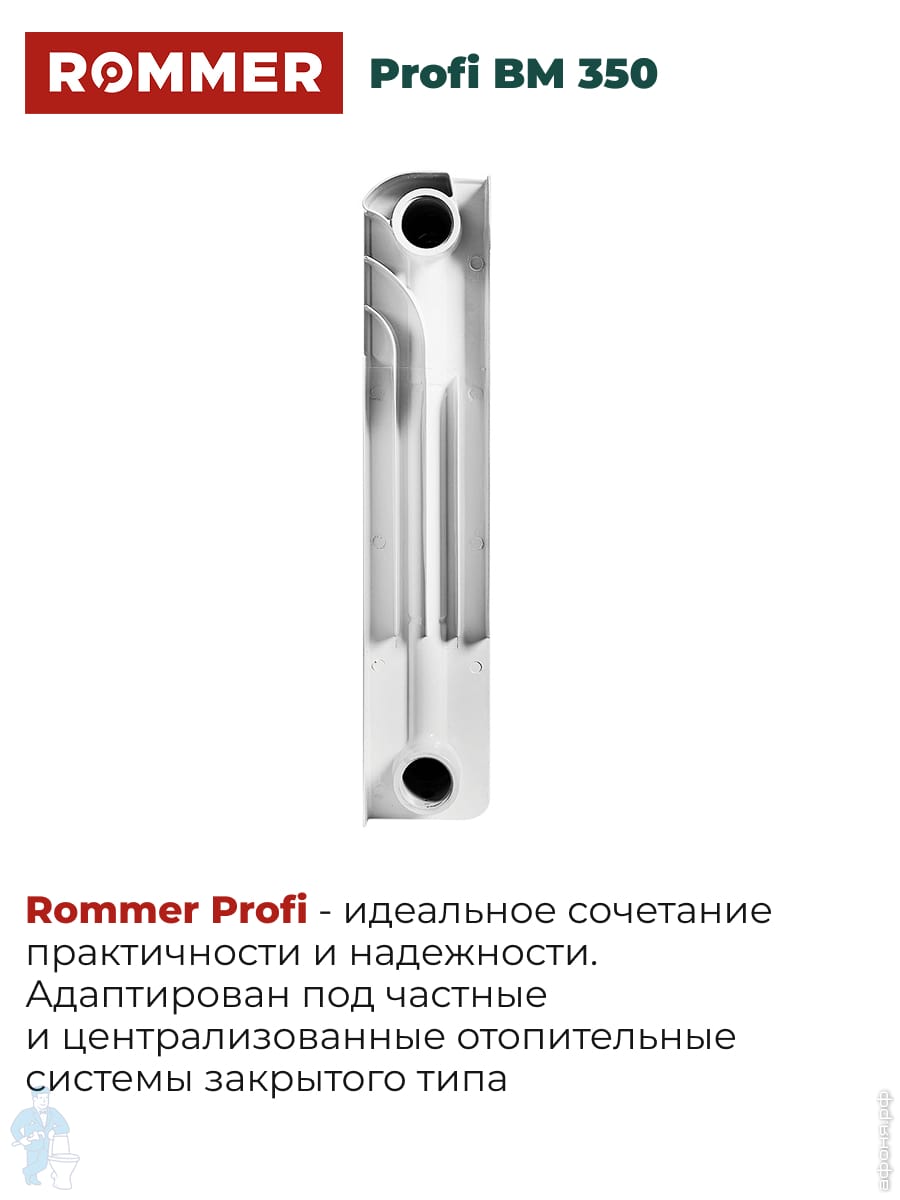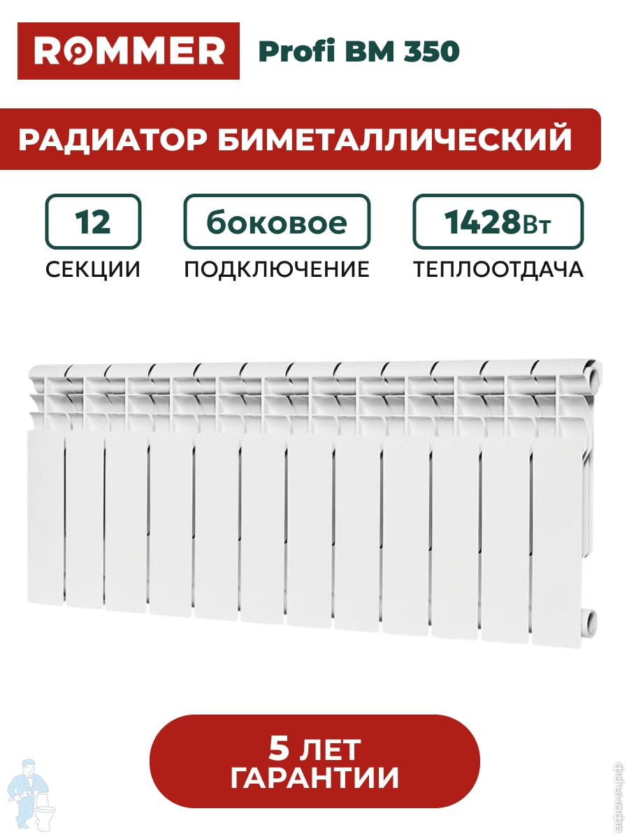 Радиатор биметаллический Rifar Base Ventil BVR 350 нижнее правое подключ., 12 секций, 1668 Вт, белыйКод: 72190