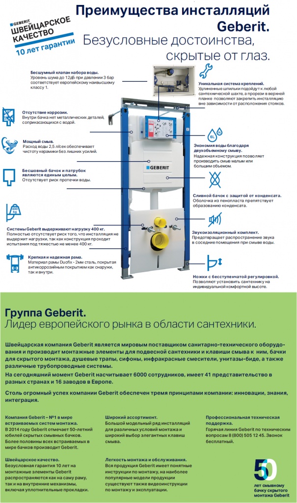 Швейцарская компания Geberit была основана в 1874 году, и поэтому совсем неудивительно, что за столь длительный срок существования превратилась в одного из наиболее крупных и авторитетных производителей сантехнической продукции в мире. Одной из главных отличительных характеристик этой фирмы является то, что она всегда стремится следовать в русле новейших тенденций технического прогресса и постоянно внедряет в производство новейшие технологии, что позволяет ей оставаться лидером в своей отрасли бизнеса.