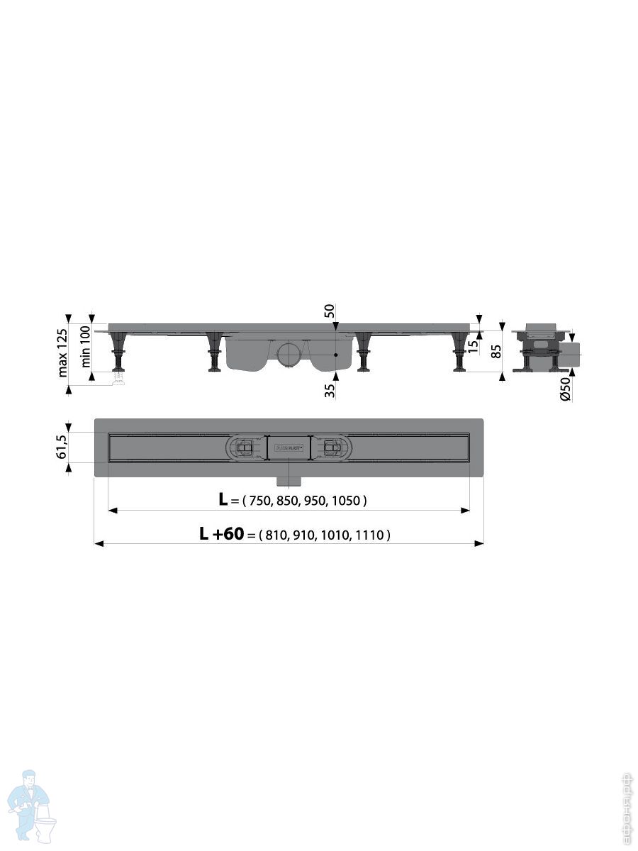 Душевой лоток Alcaplast APZ12-1050 Optimal L=1050мм Н=100мм пластик, для перф.решетки или под плиткуКод: 81744