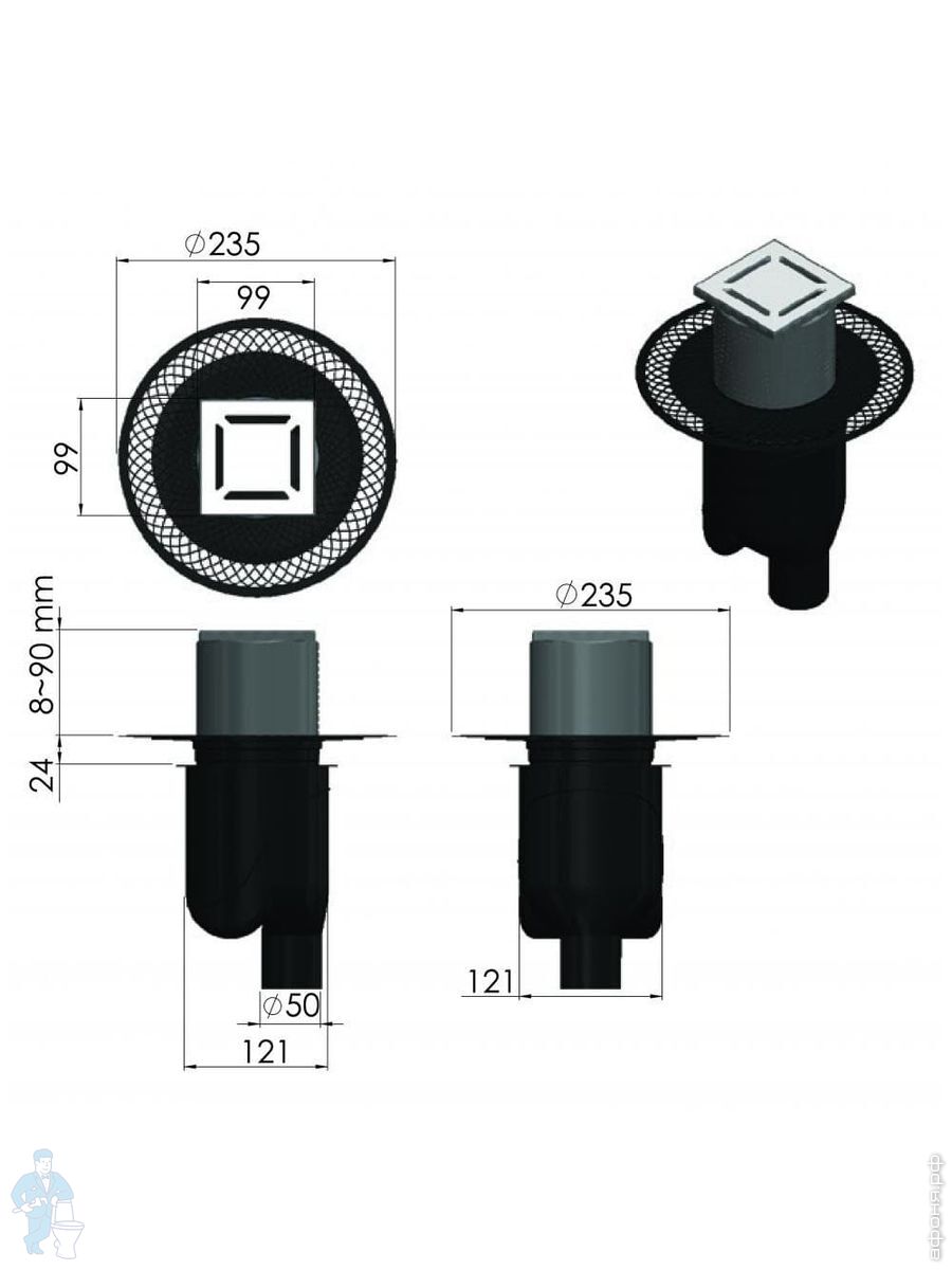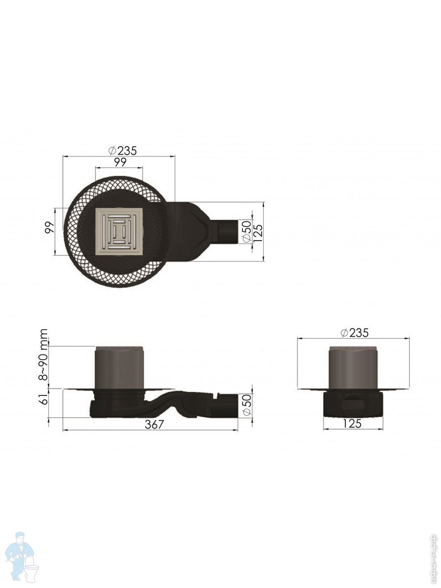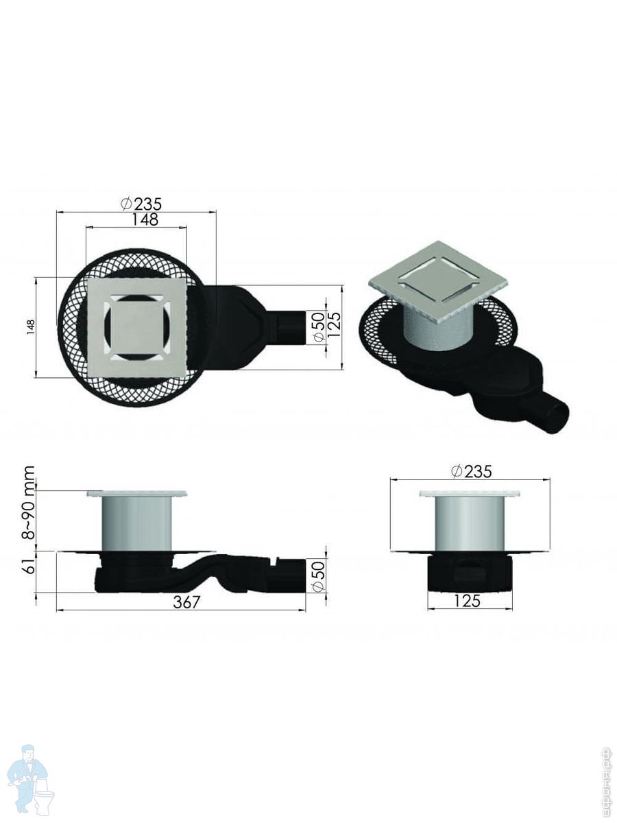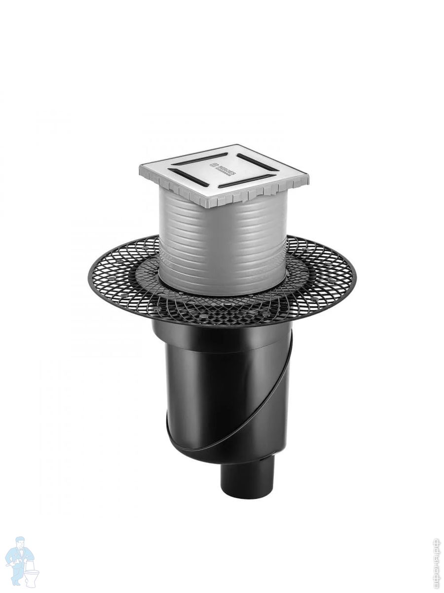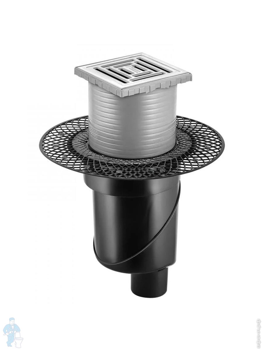 Трап душевой BERGES PLATZ Norma 150х150, хр. глянец, верт. выпуск S-сифон D50/105мм Н30/80мм, 091059Код: 259254
