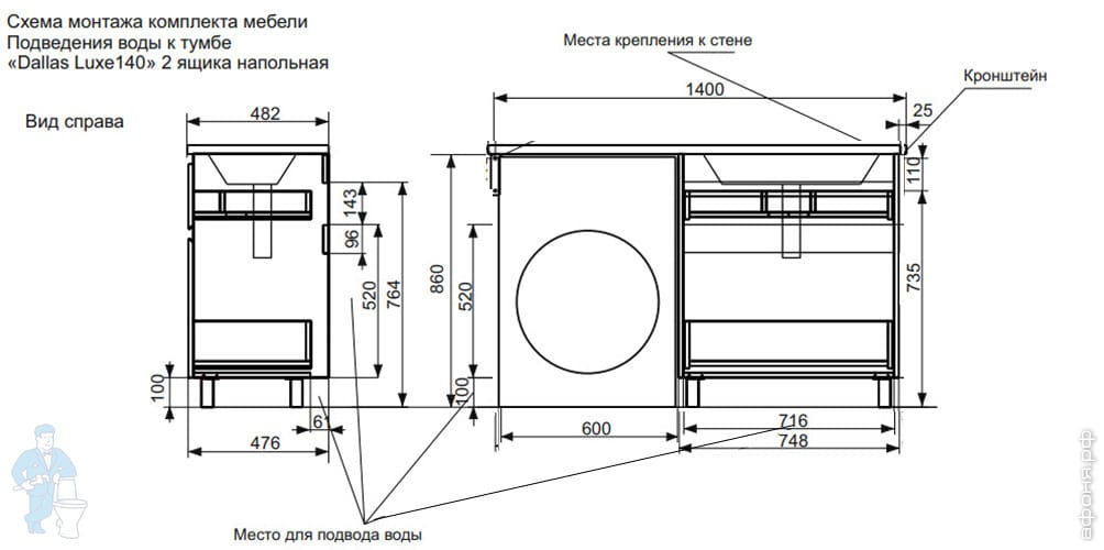 Тумба со столешницей Estet Dallas 1000х482 к стиральной машине, подвесная, 2ящика,правая ФР-00002314Код: 142537