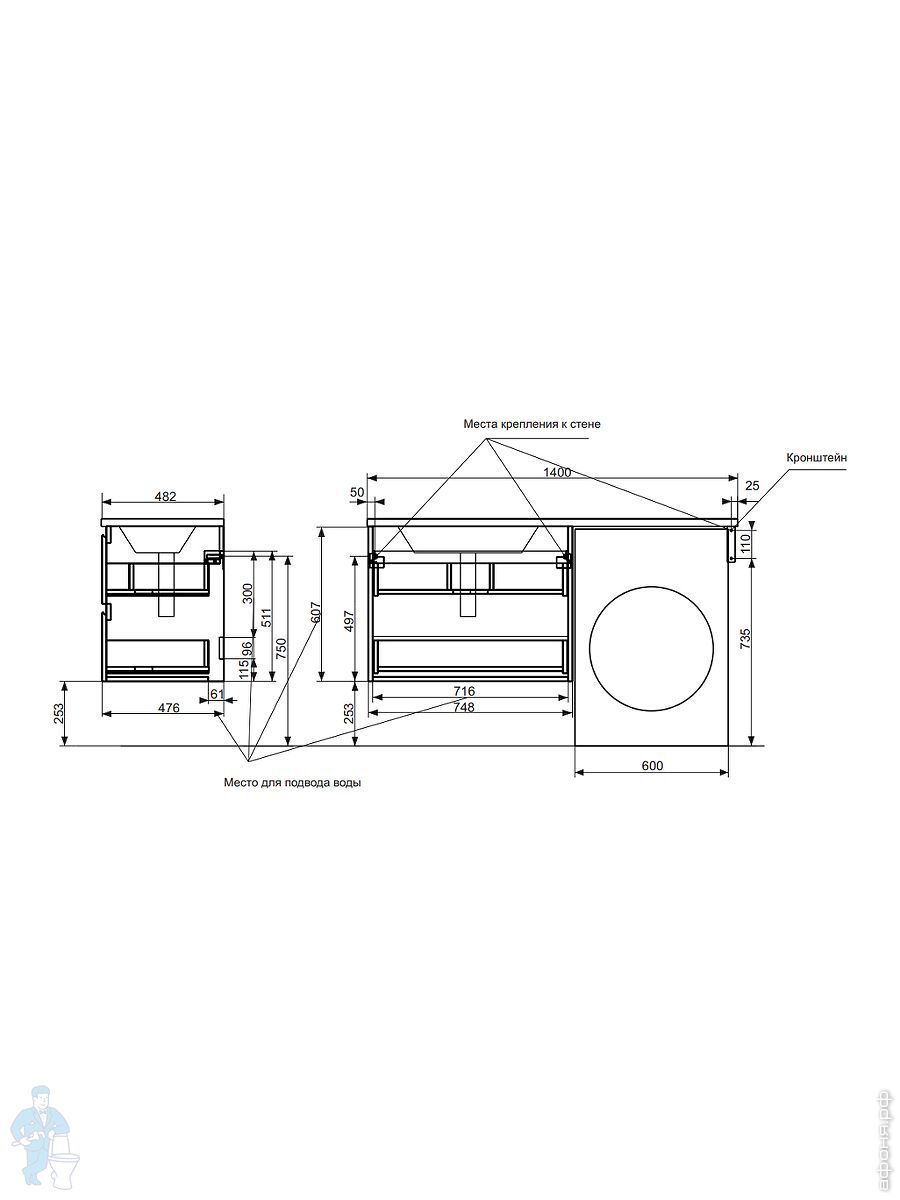 Тумба со столешницей Estet Dallas 1000х482 к стиральной машине, подвесная, 1 ящик,правая ФР-00002322Код: 142539