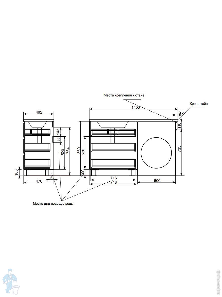 Тумба со столешницей Estet Dallas 1000х482 к стиральной машине, напольная, 2 ящика,левая ФР-00002315Код: 142531