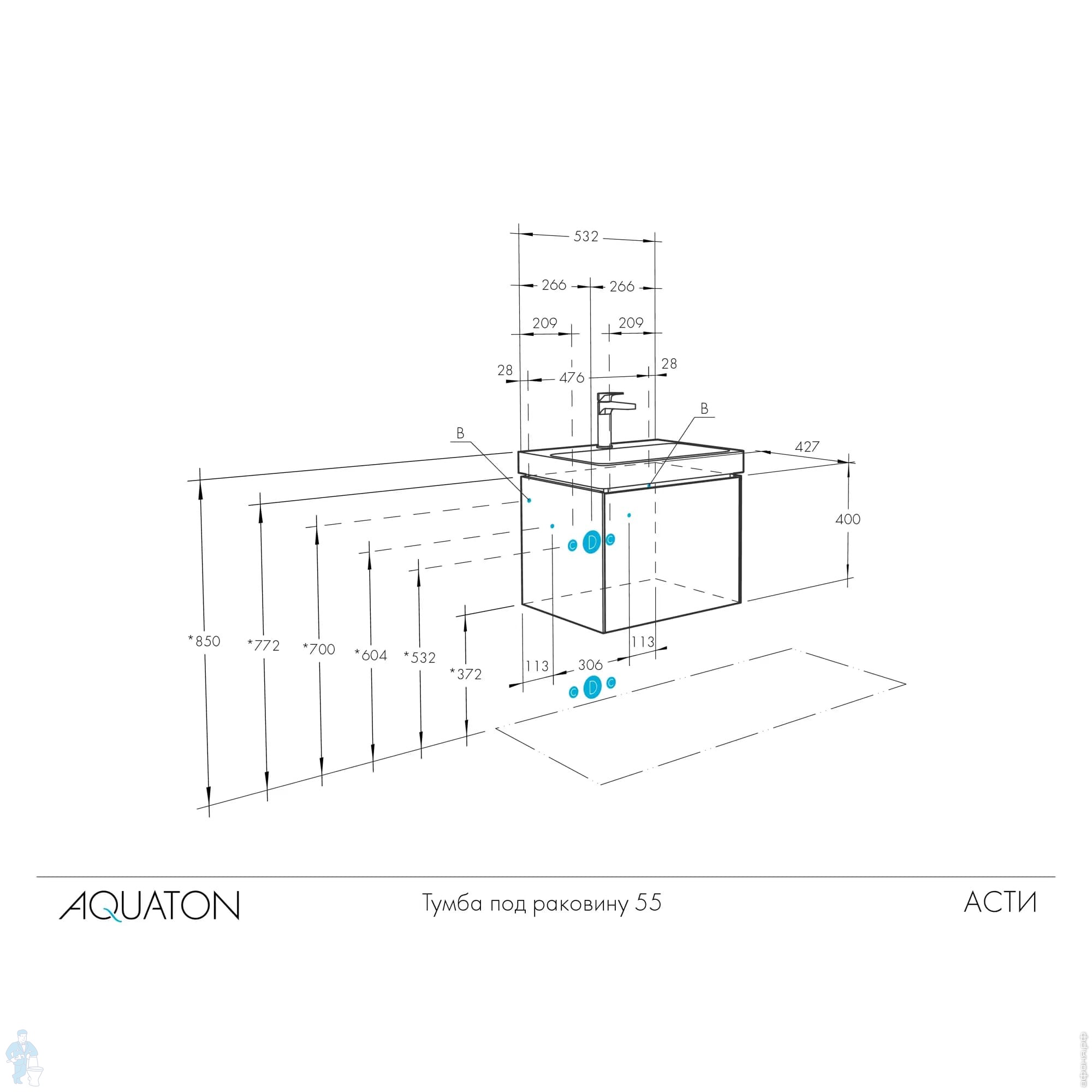 Тумба под раковину AQUATON Асти 55 (532x427x400мм) подвесная, 1 ящик, белый/ясень шимо 1A263101AXD70Код: 227929