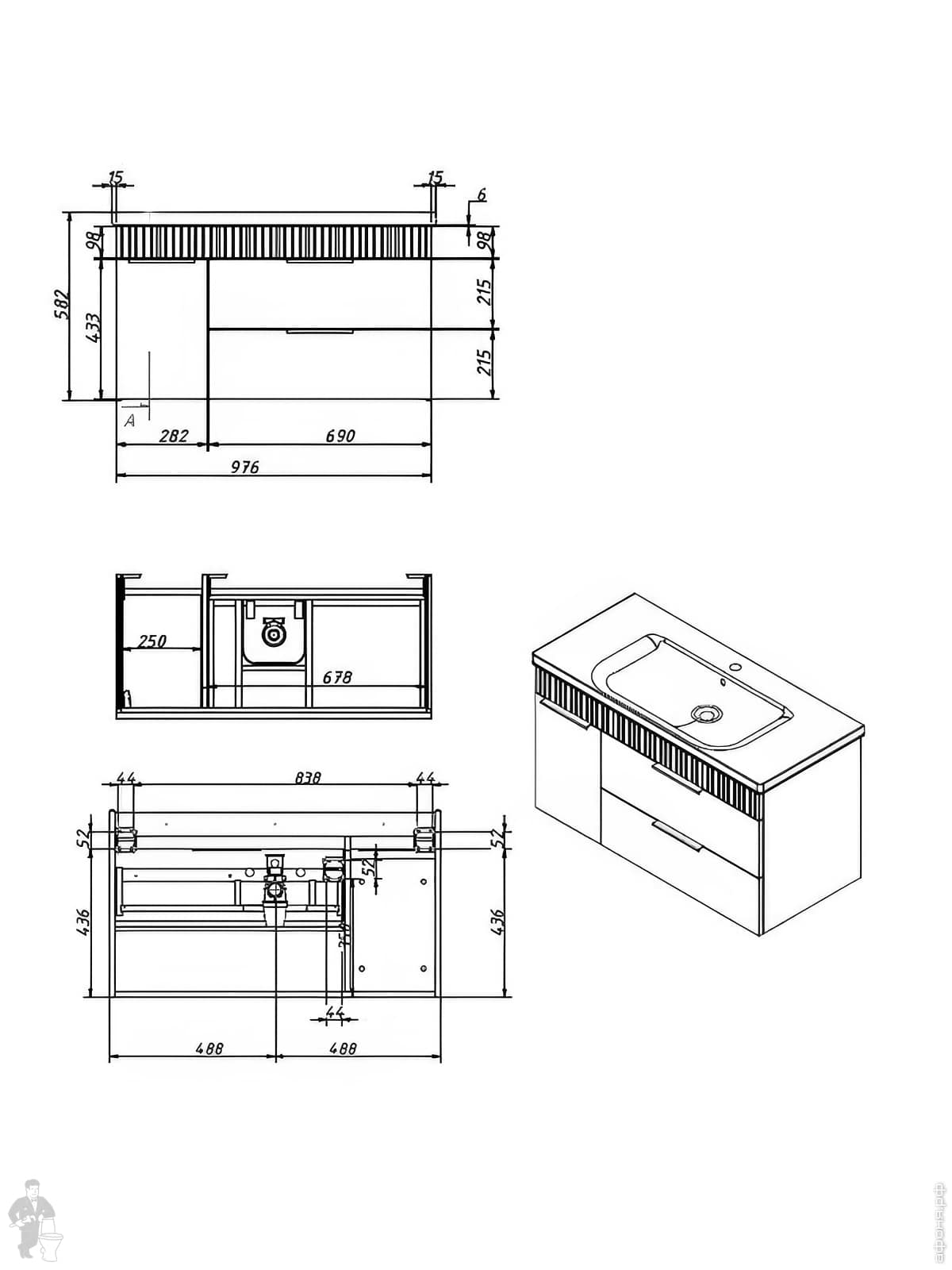 Тумба под раковину Caprigo MONBAR-Smalty 100 (976х446х550) подвесной, 2 ящика 36314eml-020.000.00.05Код: 336824