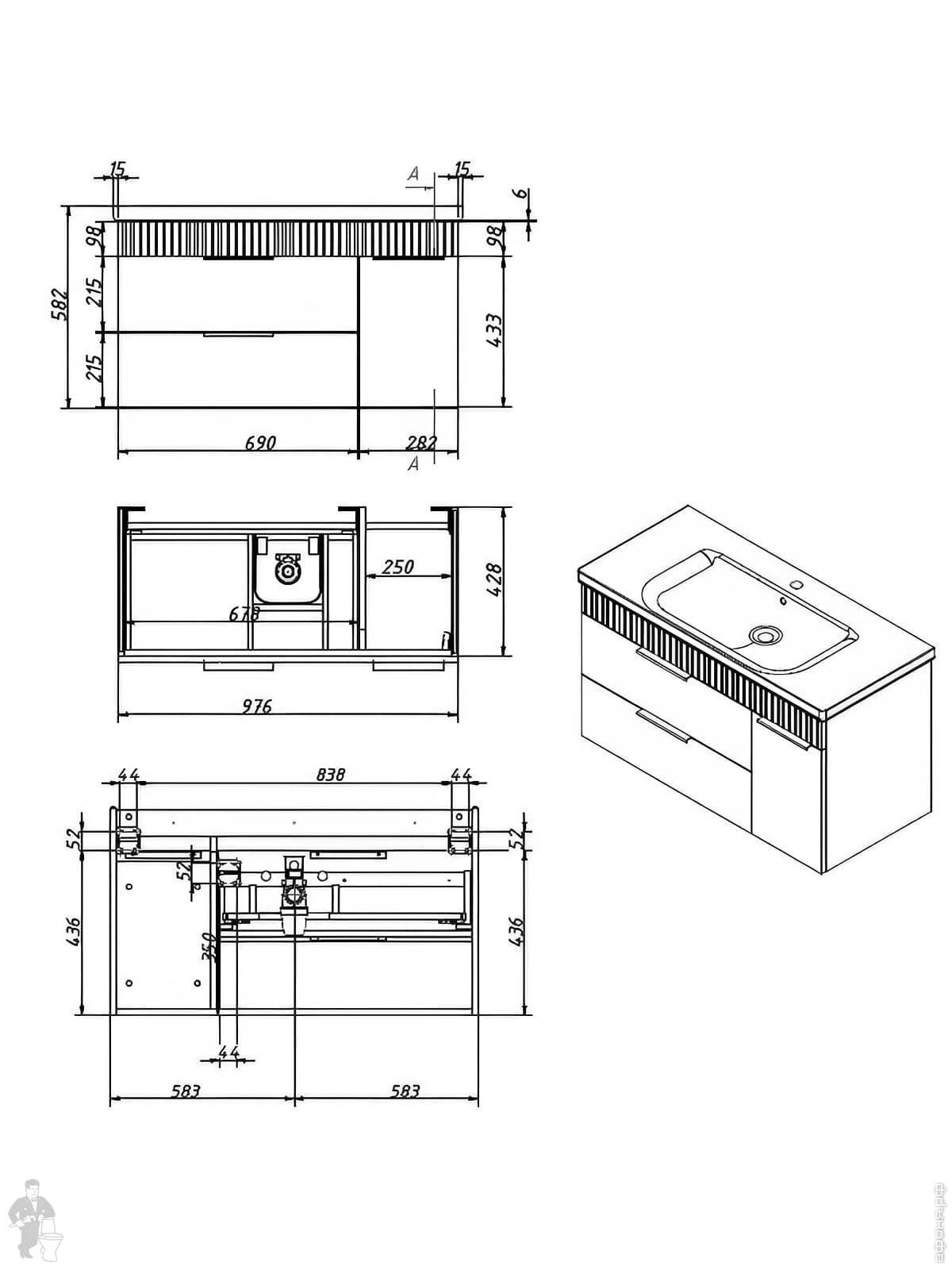 Тумба под раковину Caprigo MONBAR-Smalty 100 (976х446х550) 2 ящика 1 дв слев 36315Leml-020.000.00.05Код: 336838