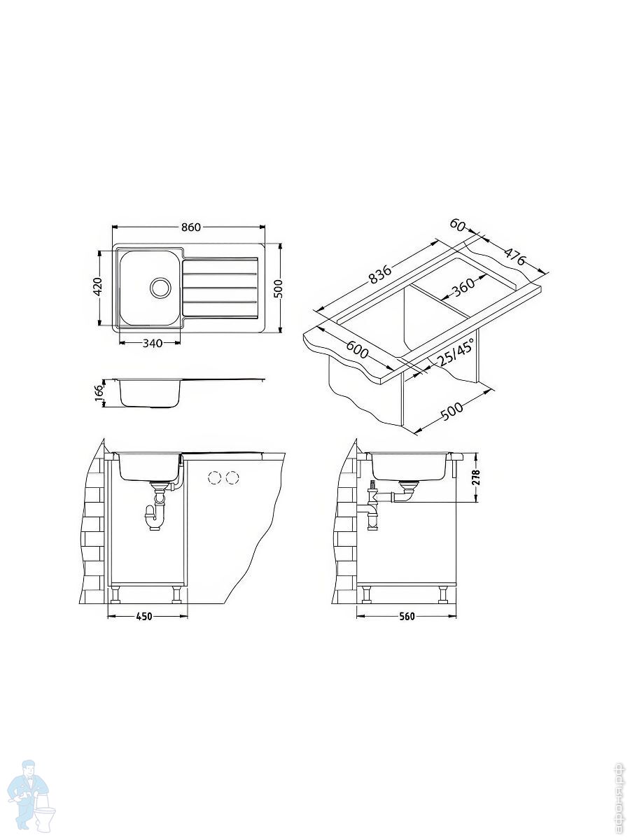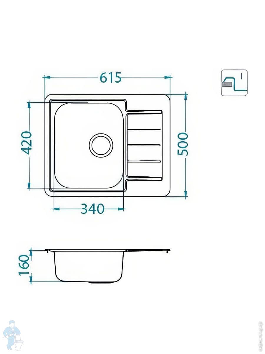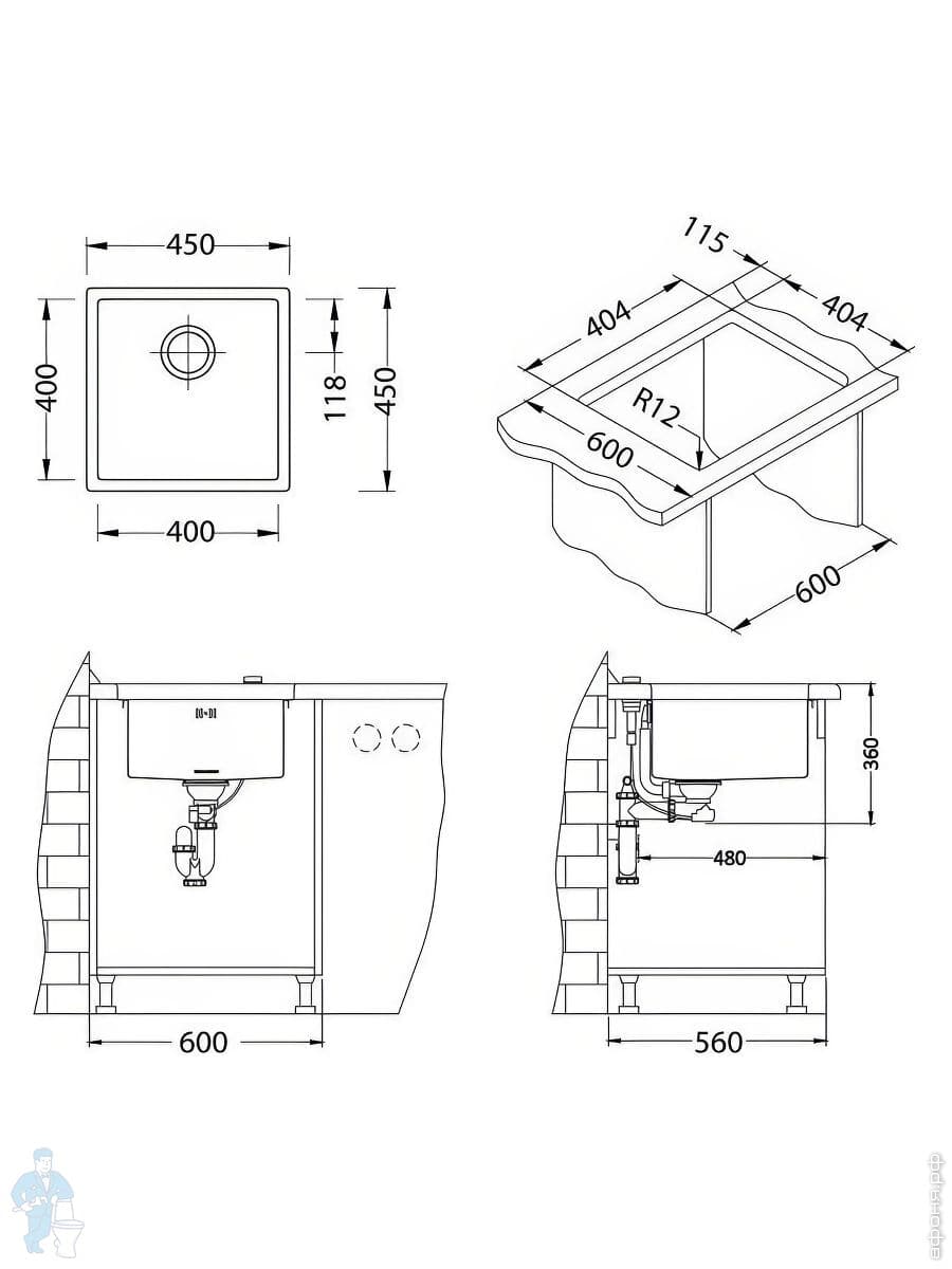 Мойка ALVEUS Monarch Quadrix 30 (450х450) монтаж универсальный, нерж.сталь 1мм, PVD антрацит 1103320Код: 309139