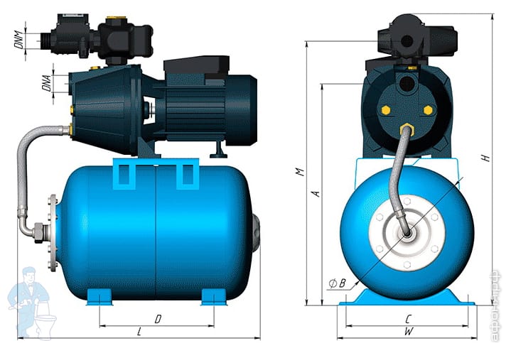 - с эжектором либо без эжектора. По типу бака насосные станции бывают:
