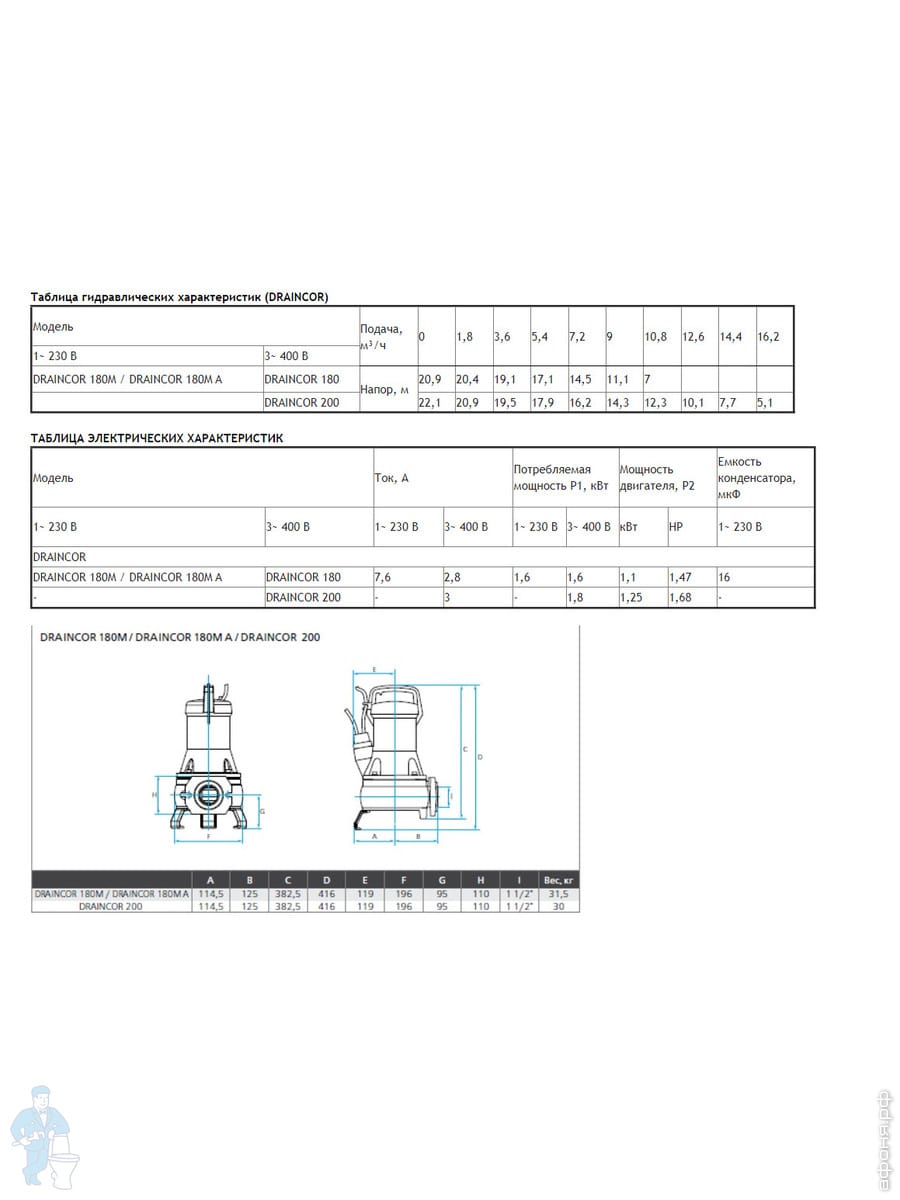 Погружной дренажно-фекальный насос с измельчителем ESPA Draincor 200 центробежный одноступенч. 96617Код: 24076