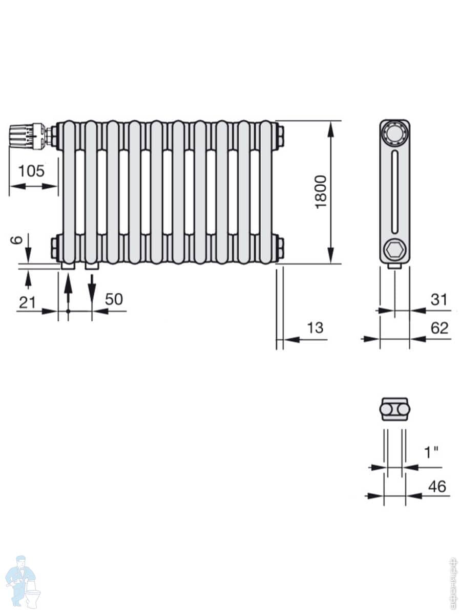 Радиатор Zehnder Charleston 2150 двухтрубчатый ВГ:1492х62, межценр.1434, боковое подкл. 3/4", 131 ВтКод: 28428