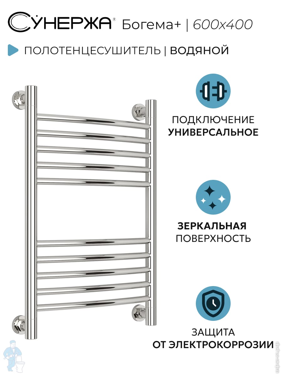 СУНЕРЖА Богема+ выгнутая Полотенцесушитель 600х400 (10 ступ.) нерж.сталь,унив.под. 3/4" 00-0221-6040Код: 124463