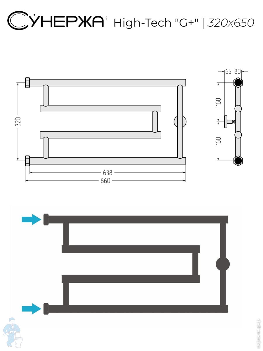 СУНЕРЖА High-Tech model "G+" Полотенцесушитель 320x650 нержавеющая сталь, верт. подключение гайка 1"Код: 161209