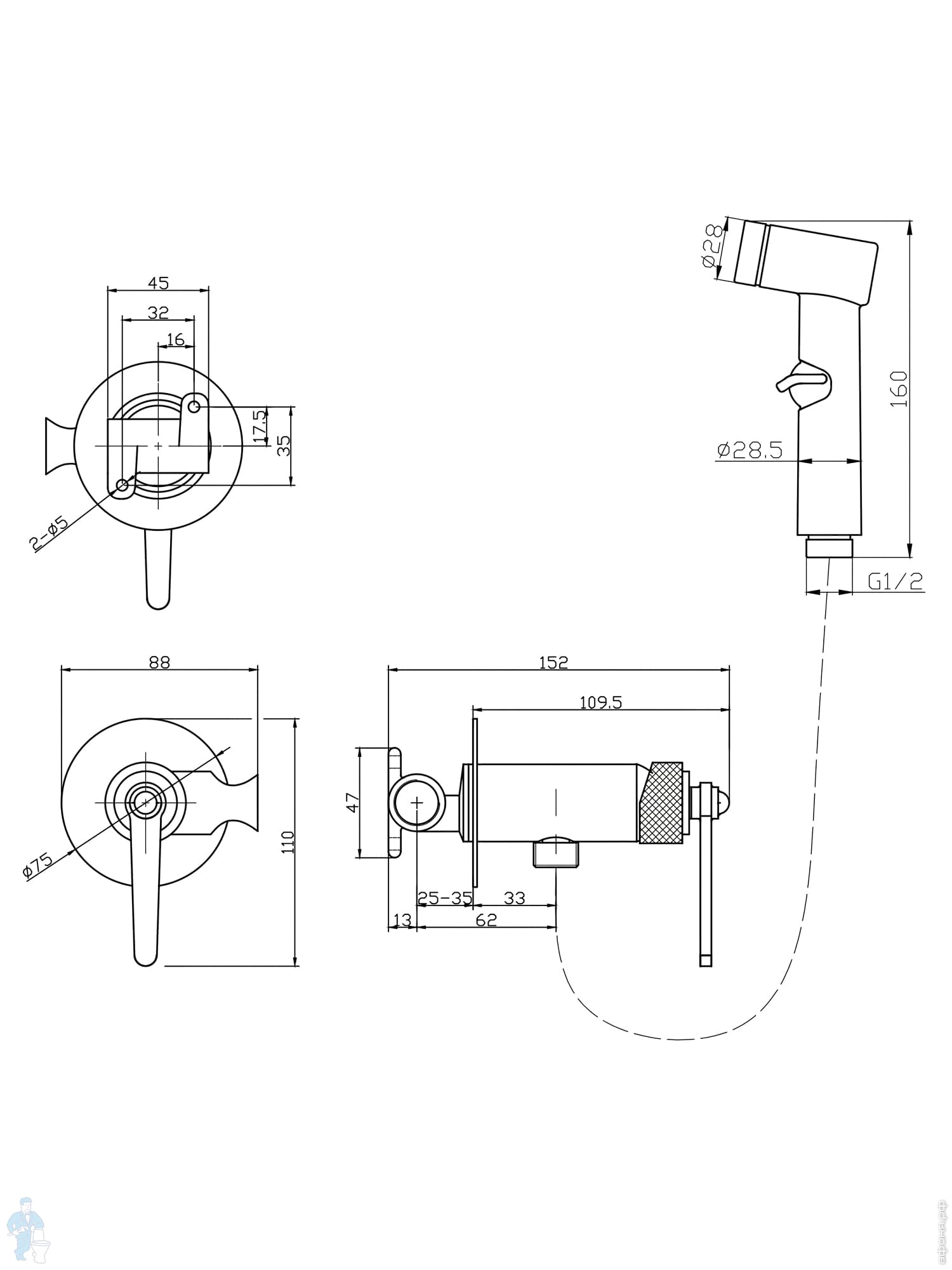 Уценка!Смеситель Paini Aosta настенный (накладной), однозахватный, гигиенический душ, хром 92CR304KMКод: 249831У1 отзыв
