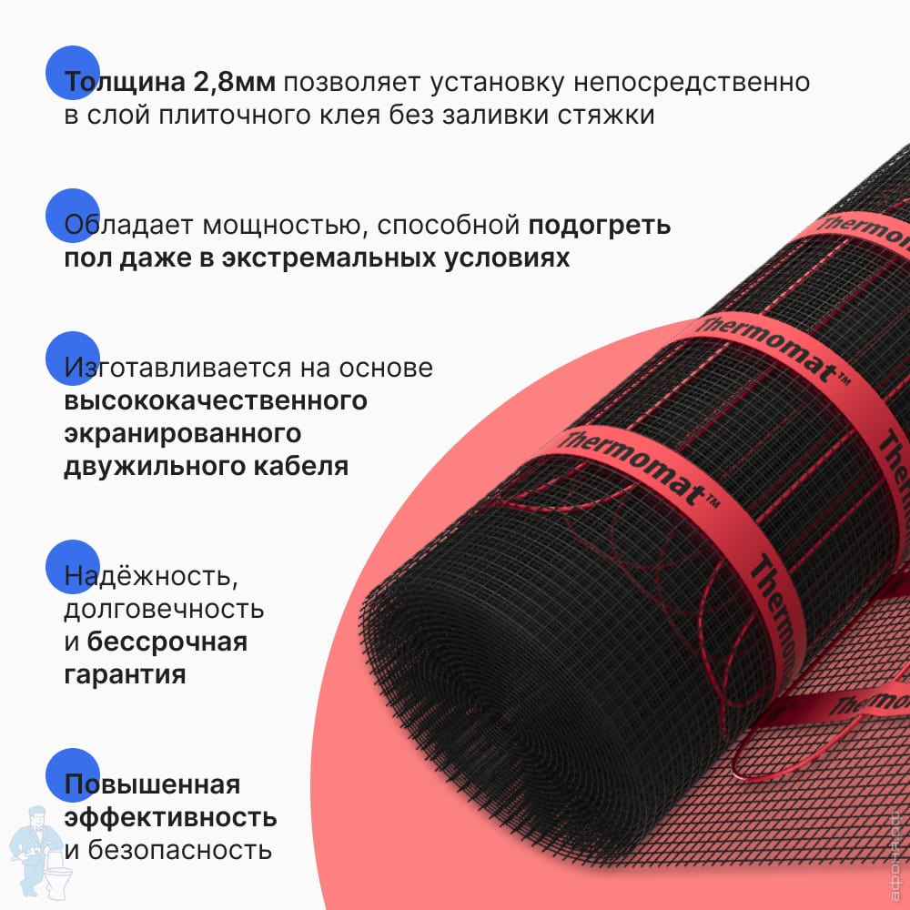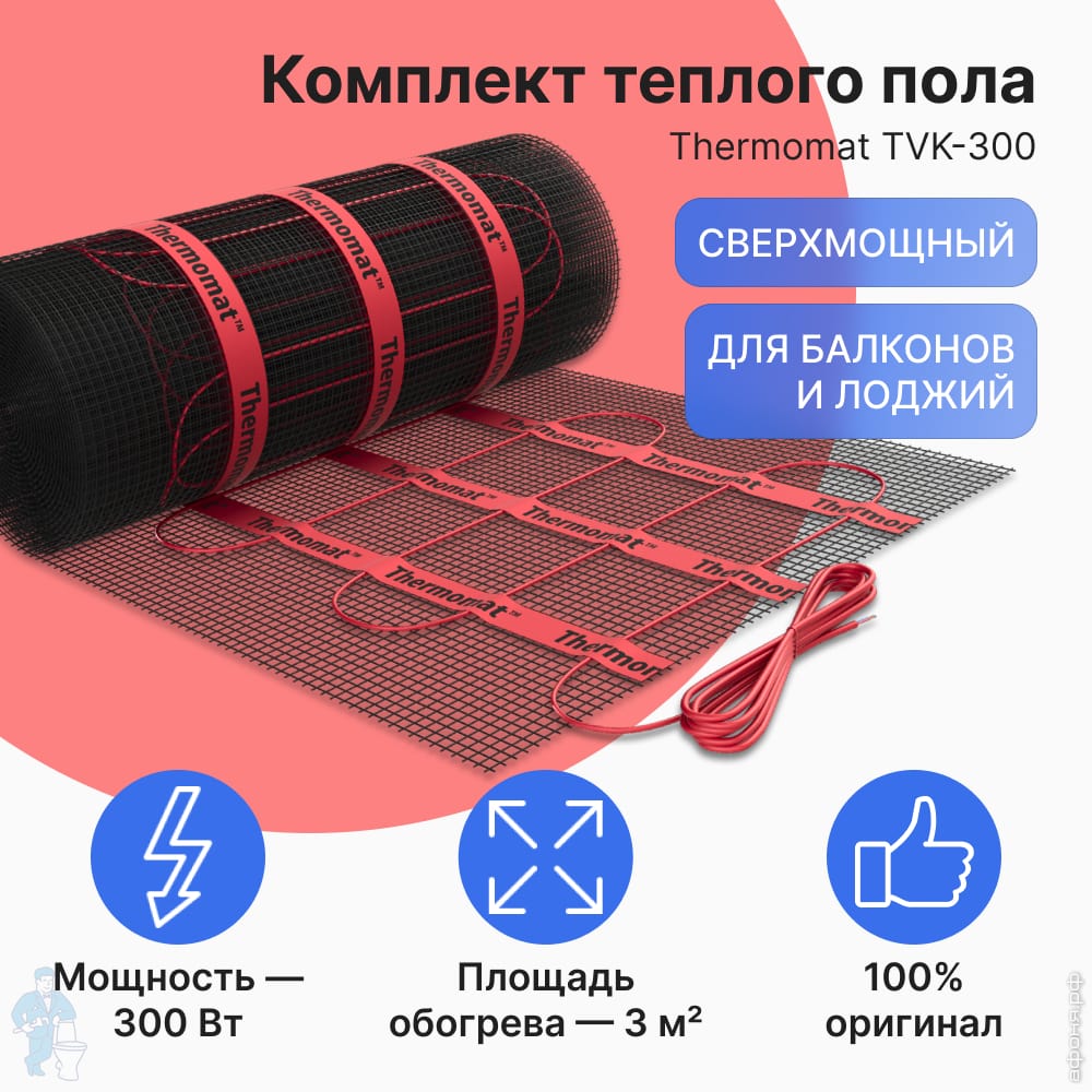 Теплый пол Thermomat TVK-210 6,6 м2, 210Вт/м2, 0,5м х 13,2м, 1386Вт сверхмощный, без терморегулятораКод: 133702