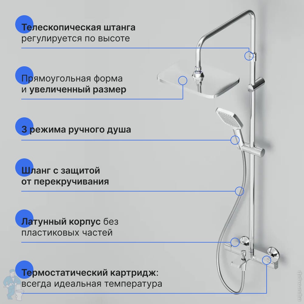 Подбор совместимых по монтажу и дизайну моделей может занять какое-то время, поэтому рекомендуем Вам приобрести душевую систему, которая представляет собой смеситель для душа в комплекте с верхним душем, штангой и кронштейном. В нашем Интернет магазине представлен также обширный ассортимент душевых колонн, которые в дополнение ко всеми прочему имеют душевую лейку со шлангом и держателем. Покупая такую душевую систему, Вы приобретаете всю необходимую сантехнику для душа разом: это не только экономит ваши средства, но и помогает обустроить душевую зону в едином дизайне.