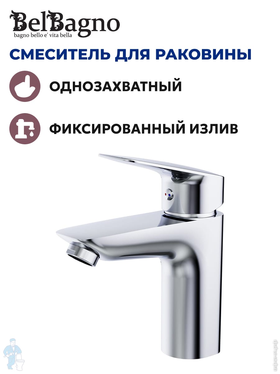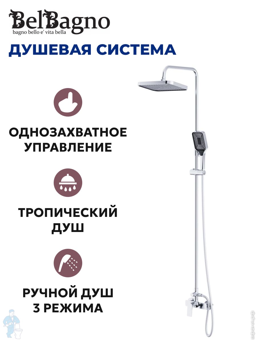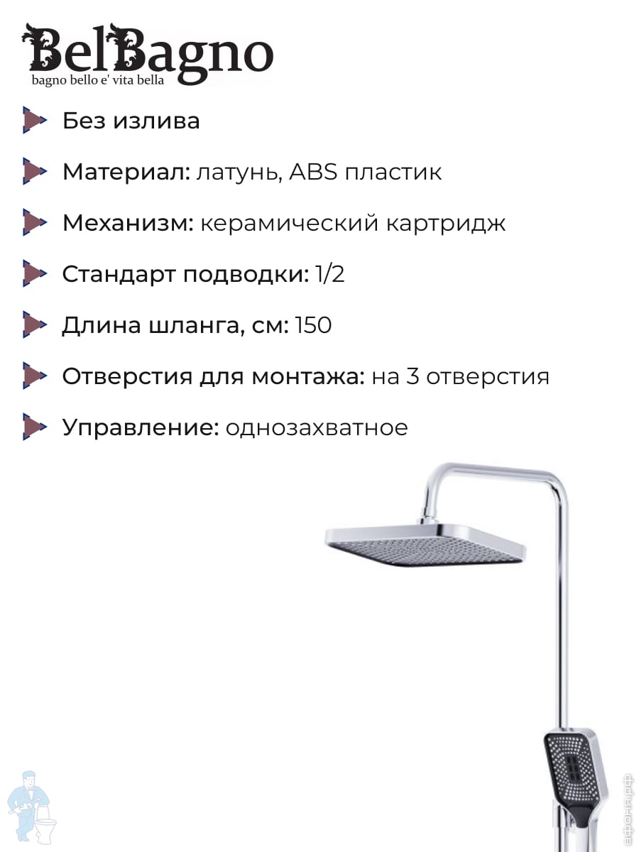 Смеситель для ванны/душа BelBagno DUE-VASM-CRM однозахватный,фиксированный излив,с ручным душем,хромКод: 312606