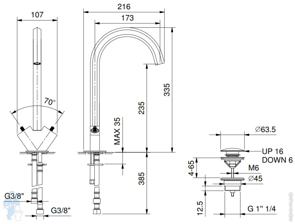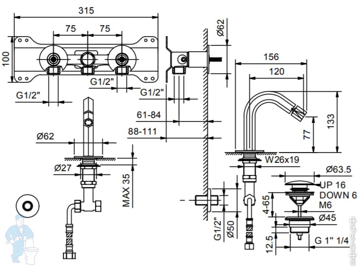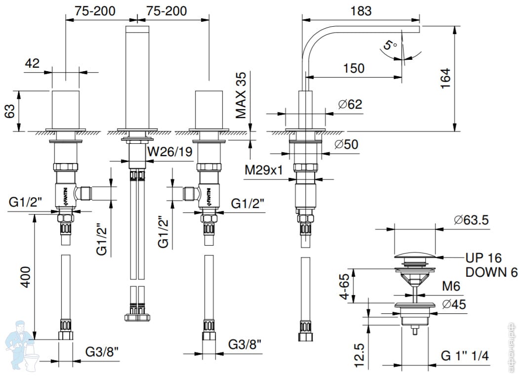 Смеситель Fantini Venezia на раковину трехсекционный с донным клапаном, излив164мм,покрытиеPVD N504SКод: 118287