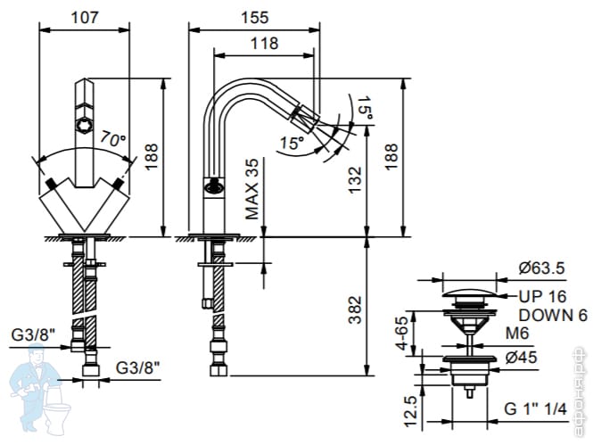 Смеситель Fantini Venezia на раковину трехсекционный с донным клапаном, излив180мм,покрытиеPVD N404SКод: 118286