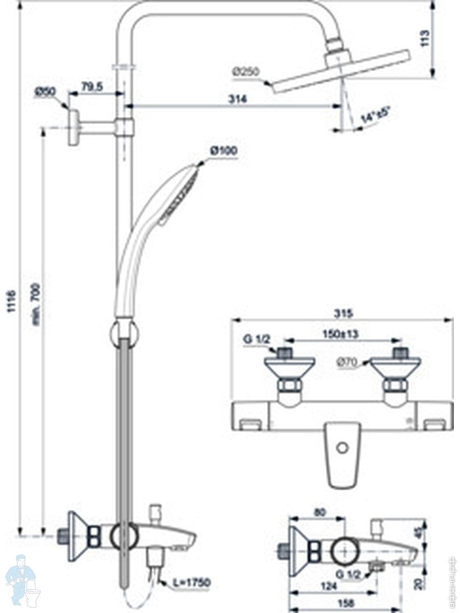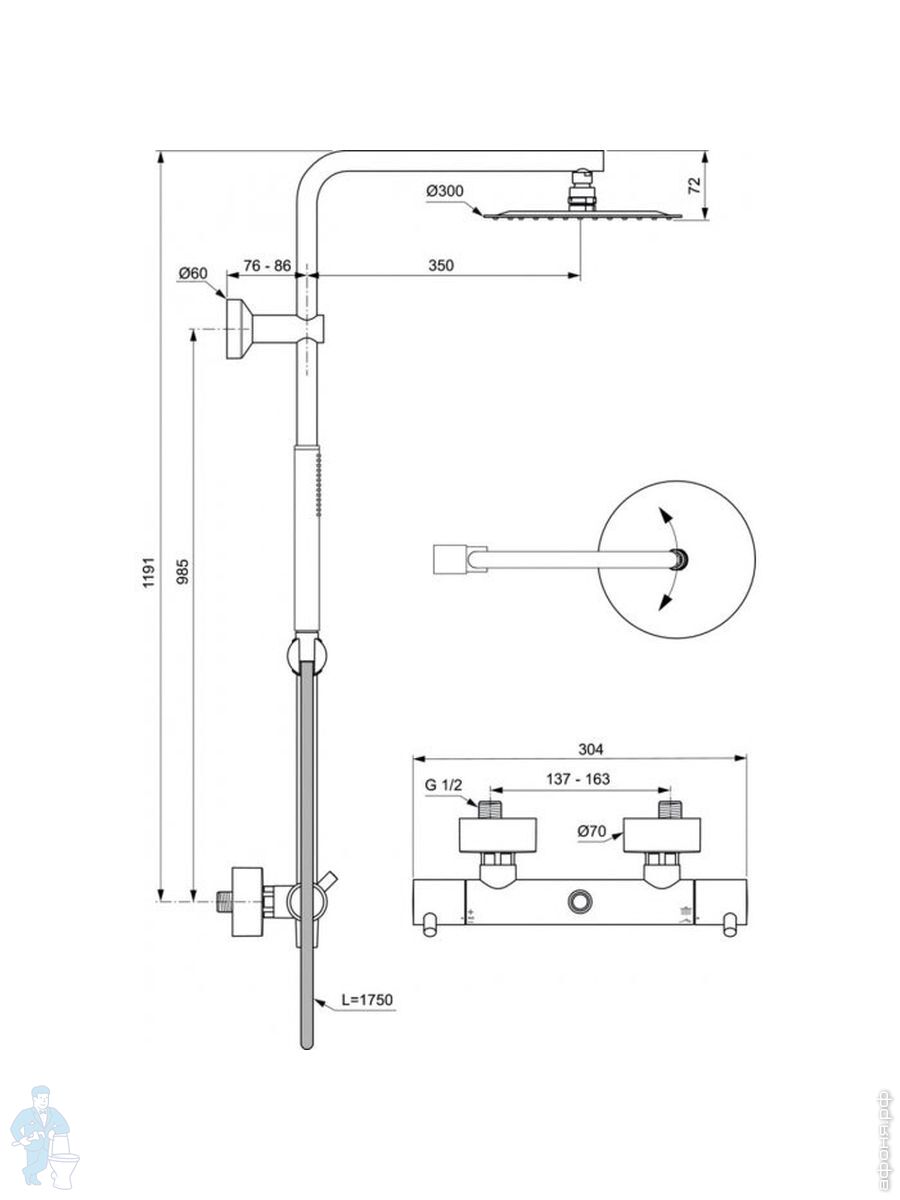 Душевая система Ideal Standard CERATHERM T125 смеситель термостат, верх./ручной душ, серебро A7589GNКод: 283528