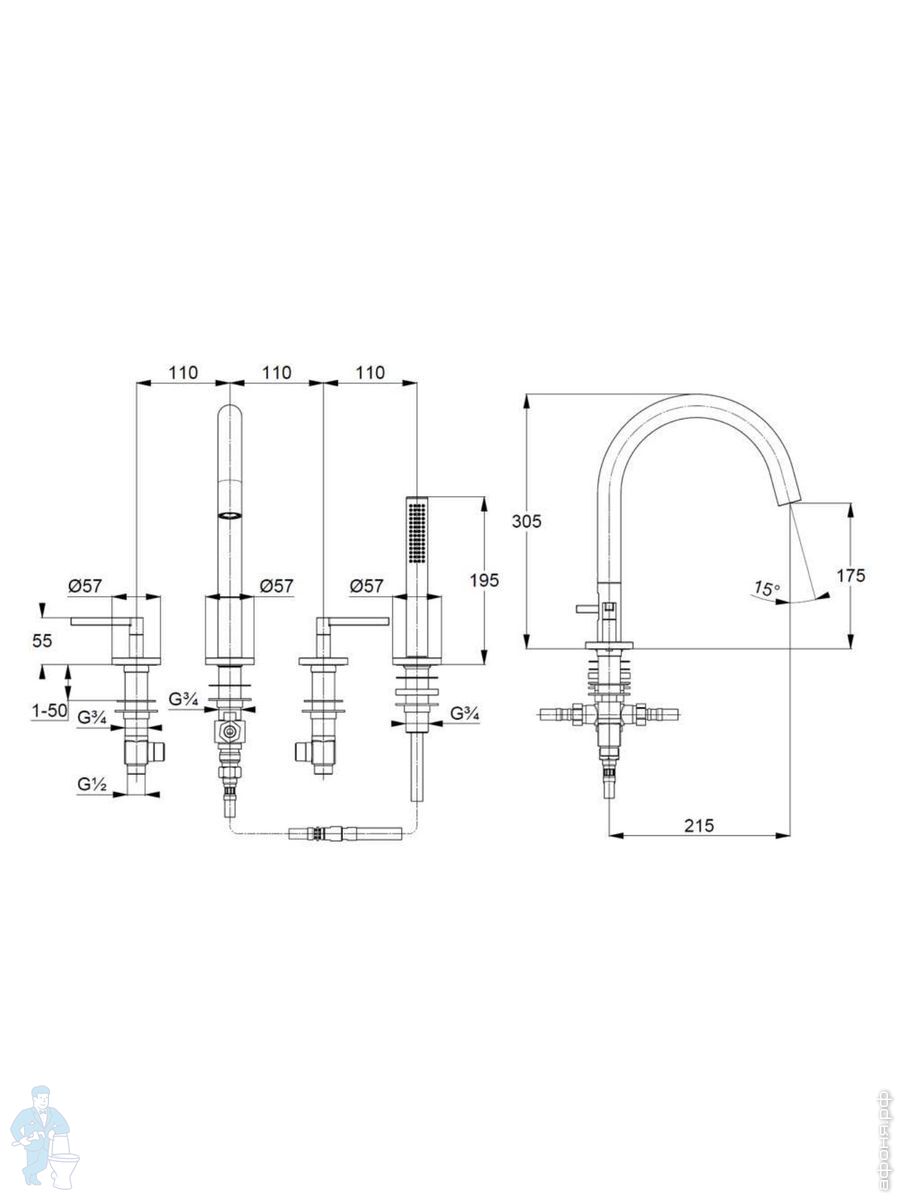 Смеситель KLUDI Nova Fonte Puristic на борт ванны, на 4 отверстия, с душ. гарнитуром, хром 204250515Код: 297524