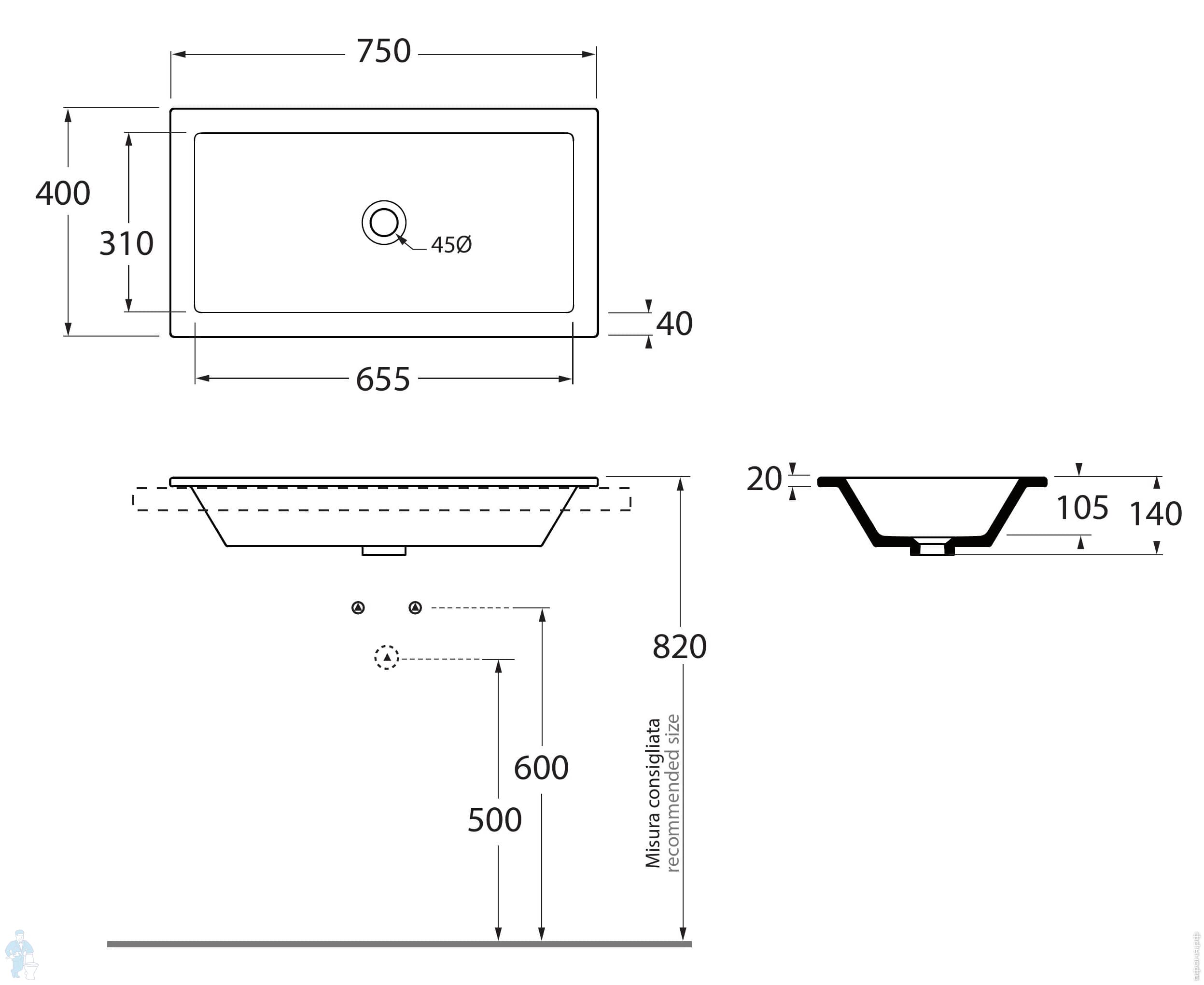 Умывальник Azzurra Thin (750х400х140) встр.сверху, б/отв. под смес. и перелива, белый THLI07540000BIКод: 281797