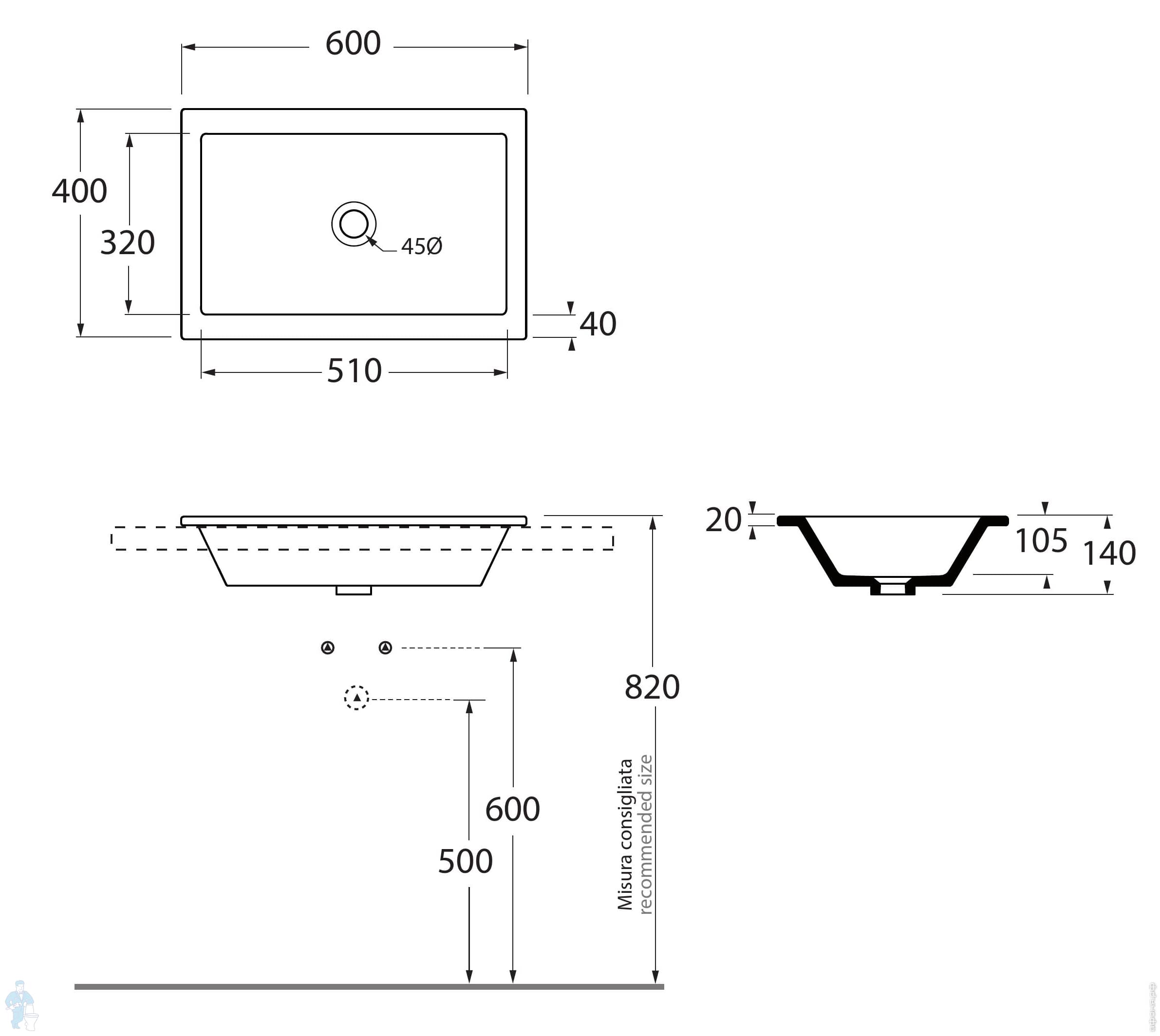 Умывальник Azzurra Thin (600х400х140) встр.сверху, б/отв. под смес. и перелива, белый THLI06040000BIКод: 281796