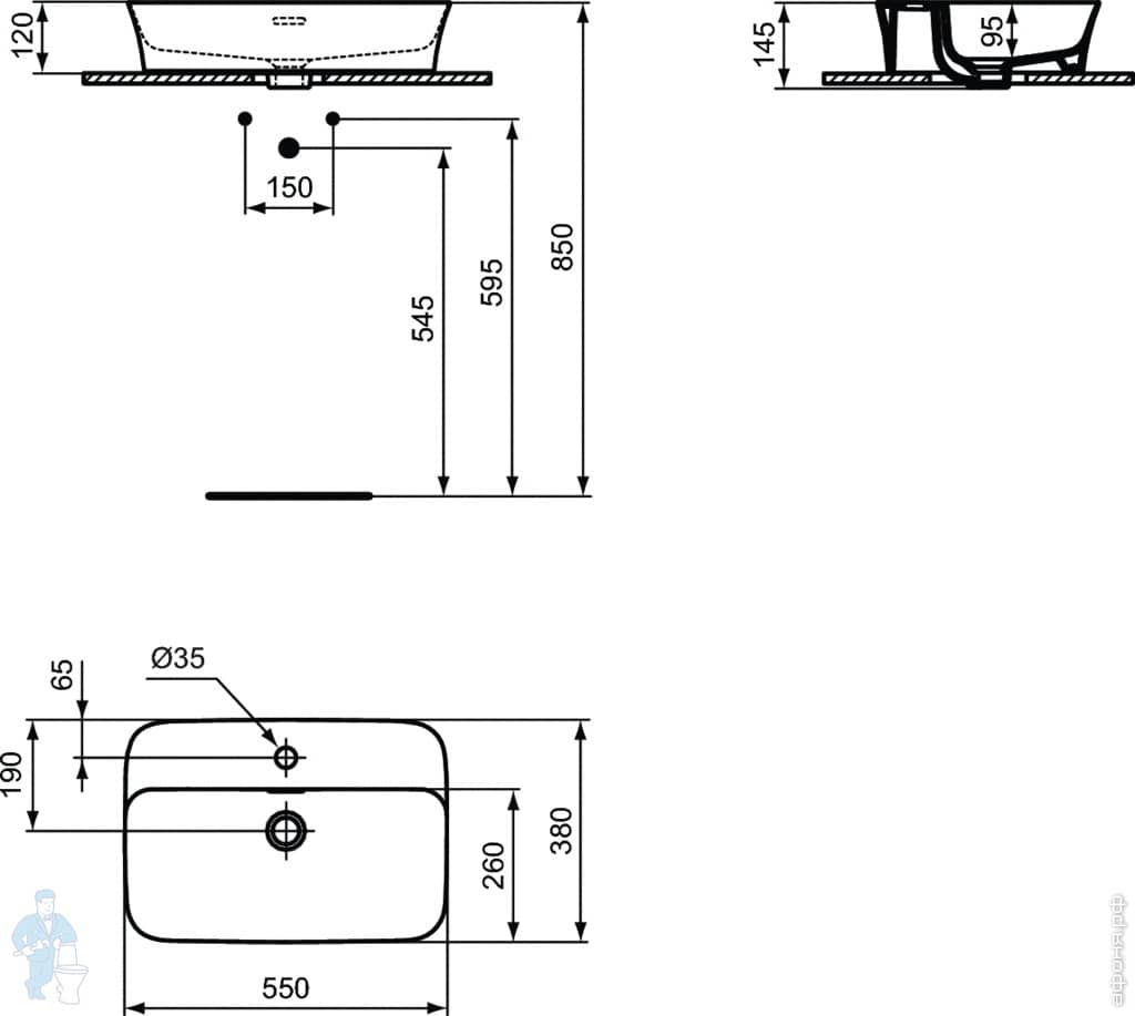 Умывальник IPALYSS Ideal Standard (550х380х145) отвер под смеситель, перелив, черный матовый E2077V3Код: 184122