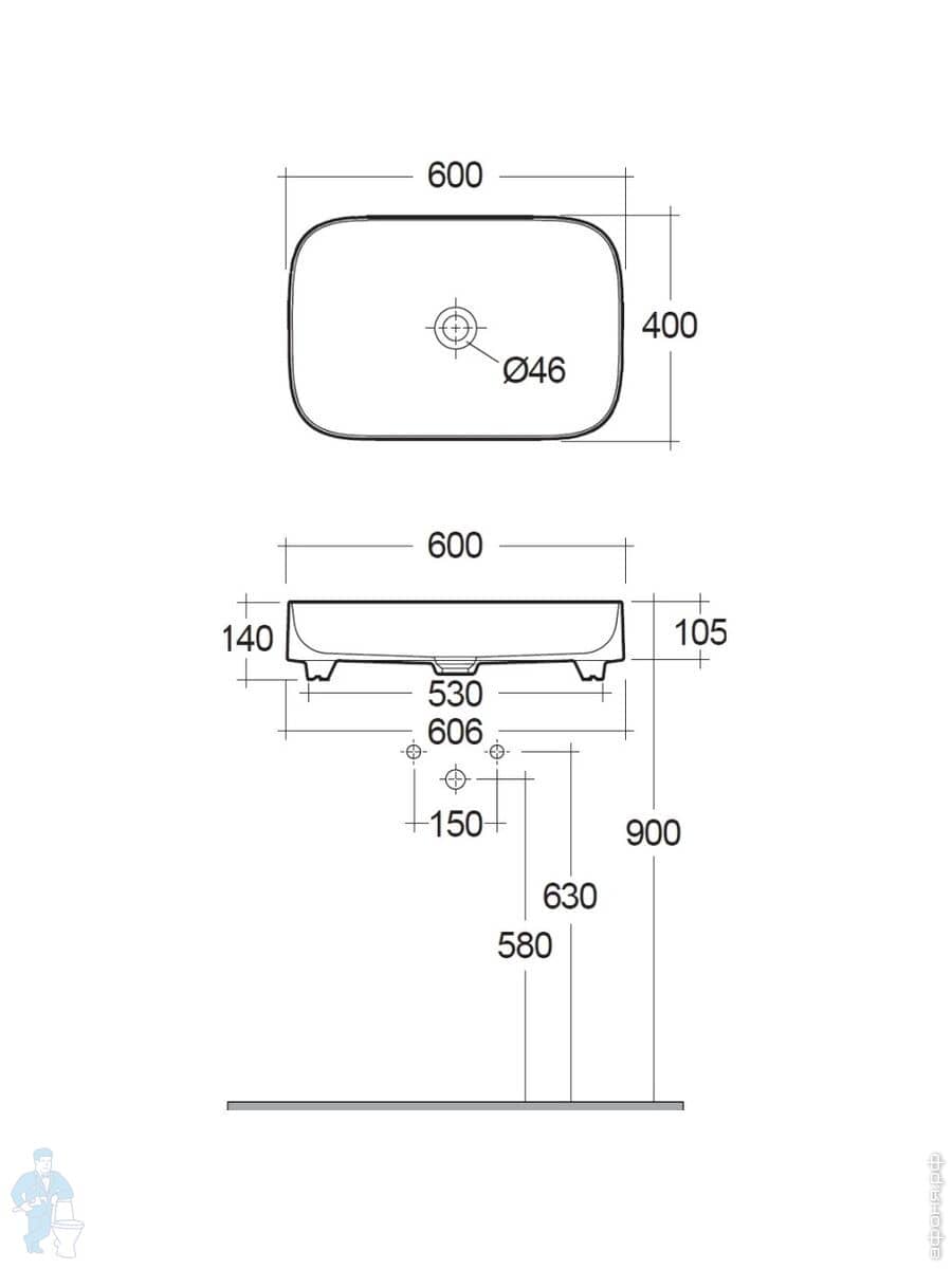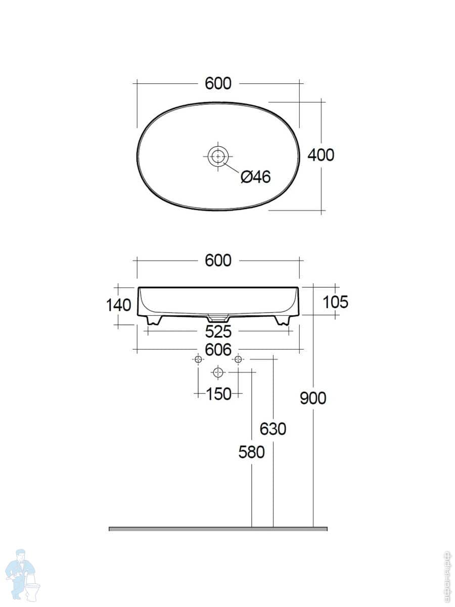 Раковина накладная KLUDI RESA S 600х400х140 прямоуг., без отв под смесит, светло-сером мат. 58CW40O2Код: 347667