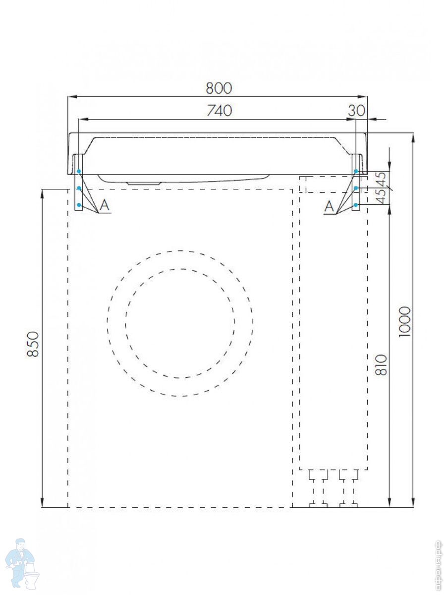 Раковина над стиральной машиной имеет форму симметричного прямоугольника и идеально располагается по периметру машины. При этом необходимо, чтобы размеры раковины совпадали или немного превышали размеры стиральной машины. Чаша умывальника «кувшинки» сравнительно плоская (глубина ее обычно 18-20 см), а пьедестал весьма компактный.