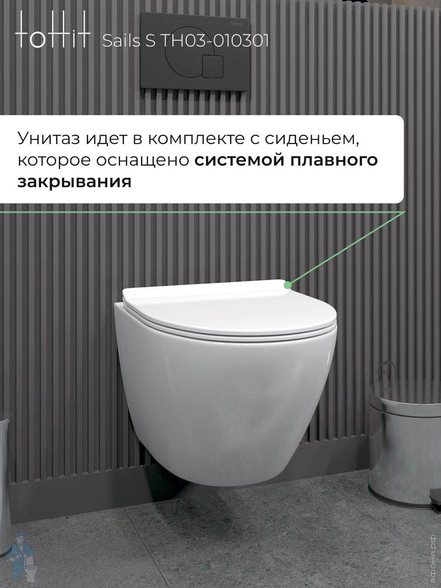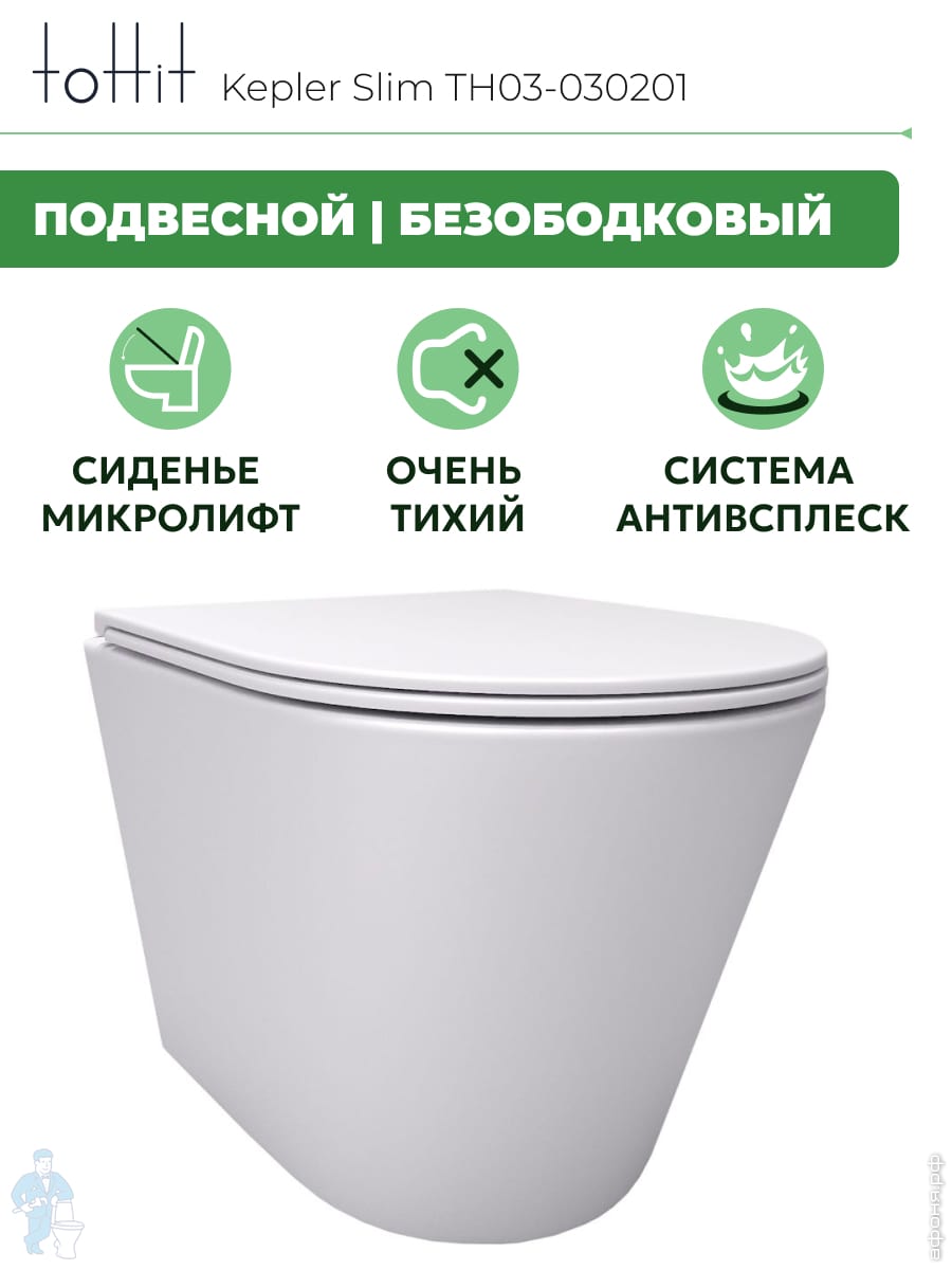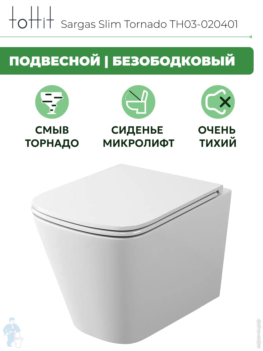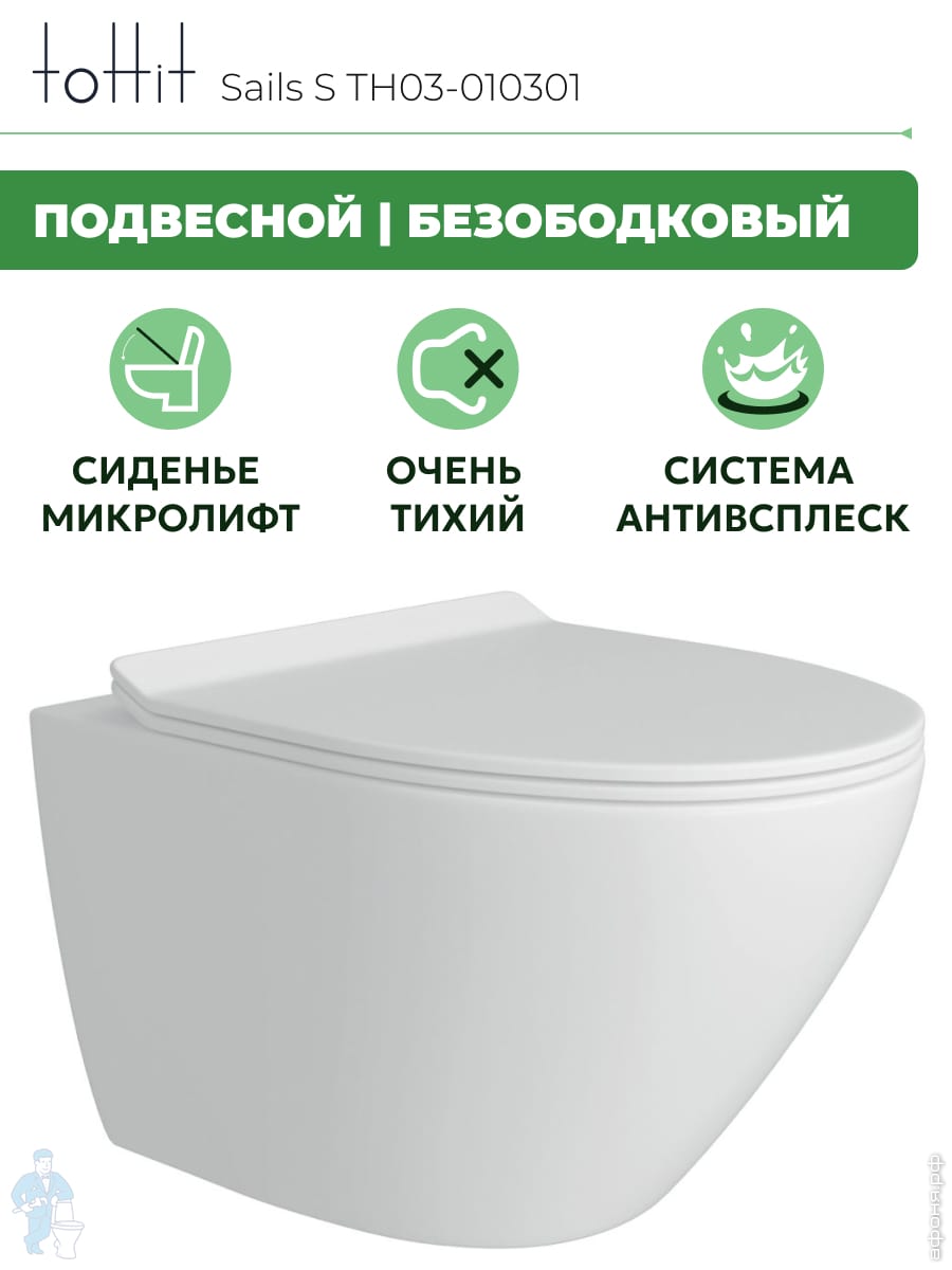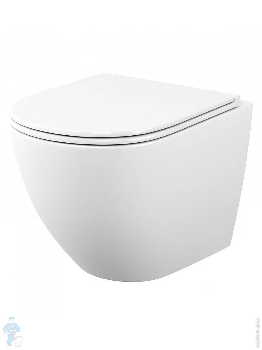 Унитаз подвесной toHit, бесшумный, безободковый, сиденье с микролифтом, белый, 525х345х360, TP092303Код: 213447