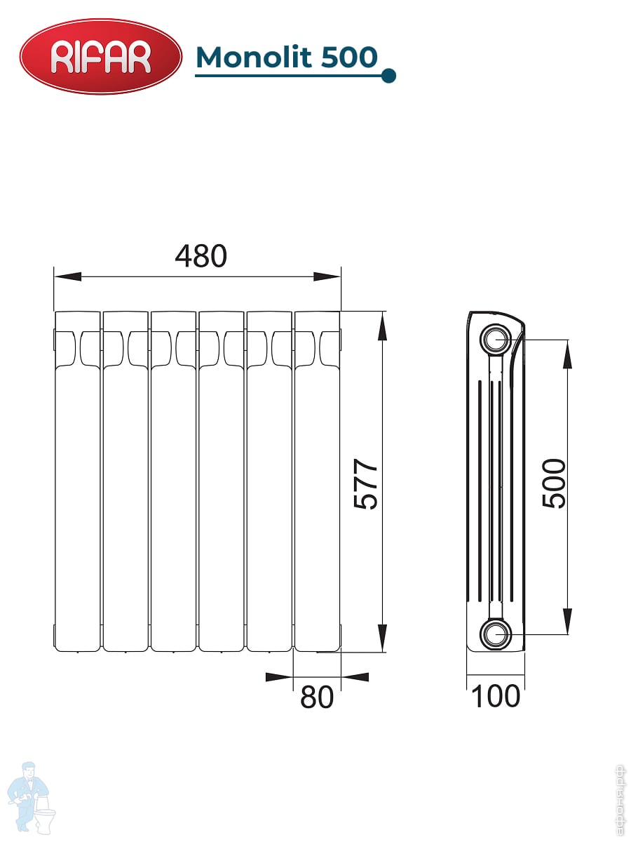 Уценка! Радиатор биметаллический RIFAR Monolit 500 (577х480х100) бок. подкл, 6 секций, 1146Вт, белыйКод: 71562У