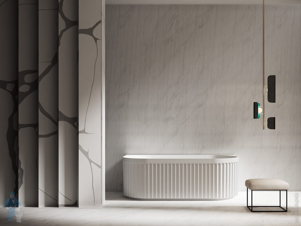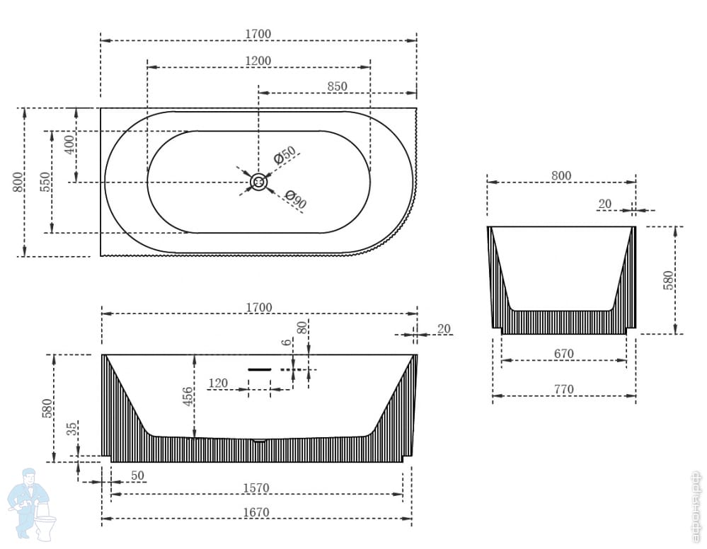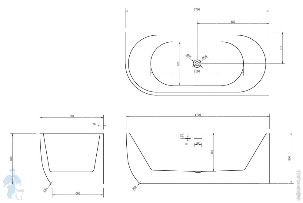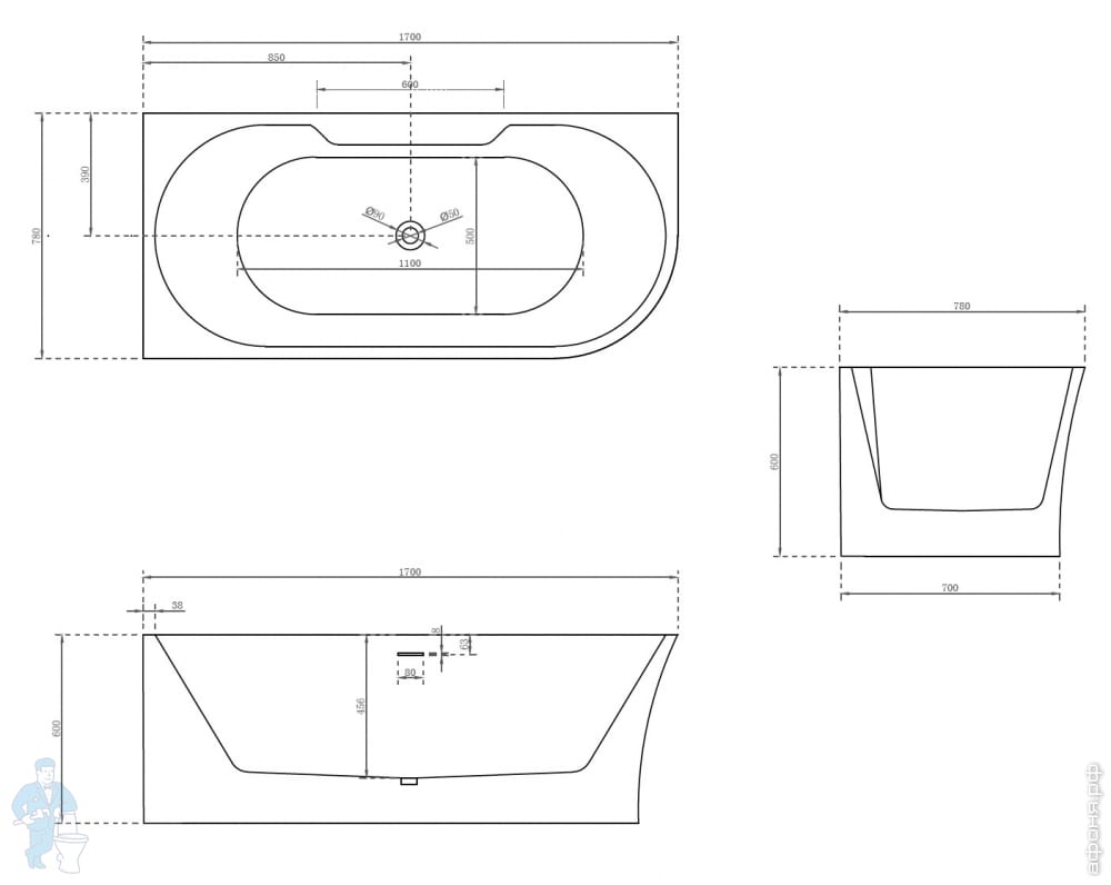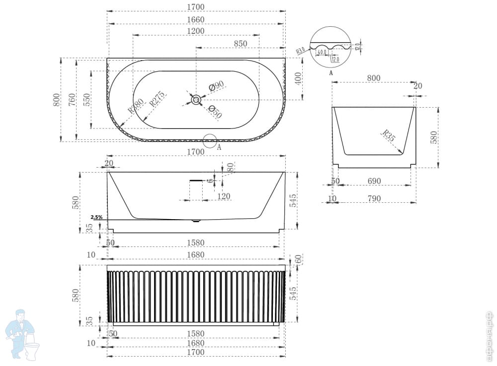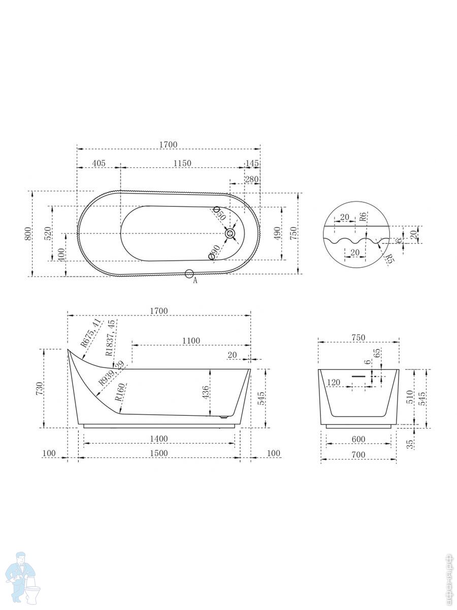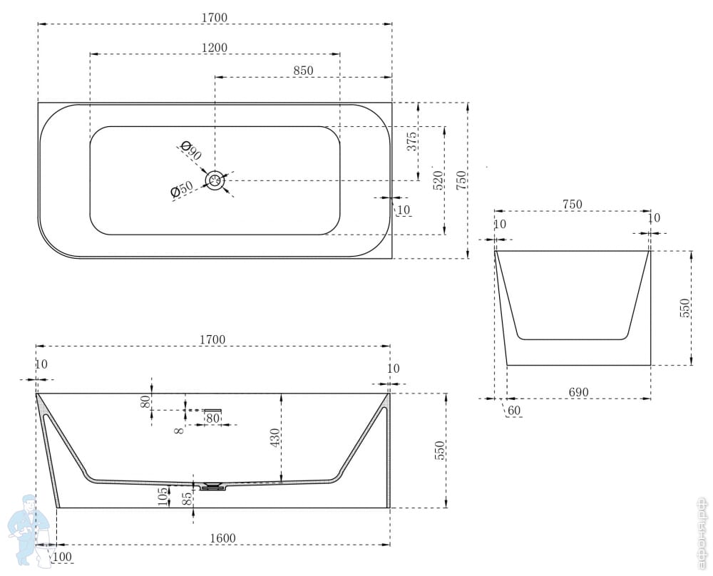 Ванна из искусственного камня Abber Stein (1700x750) отдельностоящая, слив-пер, белая мат AS9624-1.7Код: 324789
