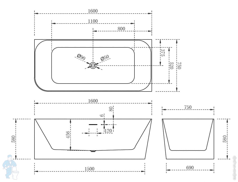 Ванна из исскуственного камня Abber Stein (1600x750) отдельностоящая, слив-пер, белая мат AS9613-1.6Код: 324739