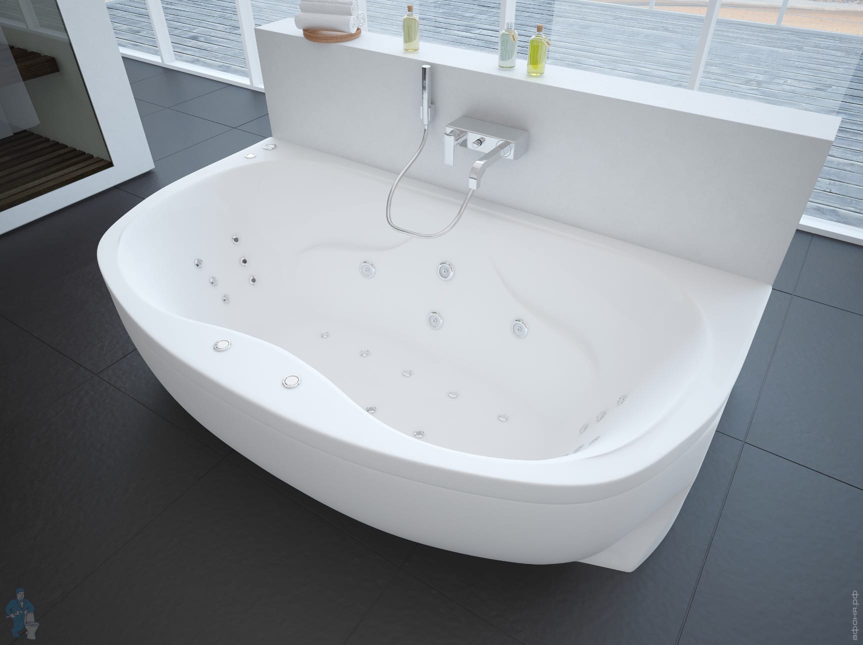 - Физиологически оправданное эргономичное размещение форсунок дает возможность воздействовать на зоны тела, наиболее нуждающиеся в мягком стимулирующем массаже.