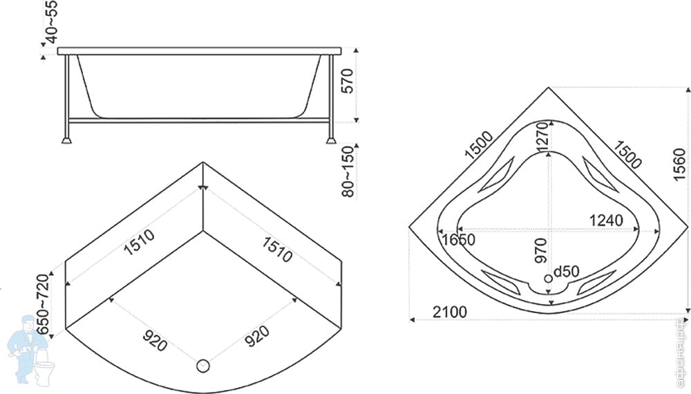 Ванна акриловая BAS Алегра 1500х900 угловая, левая, асимметричная, каркас, без слива-перелива, белыйКод: 10133