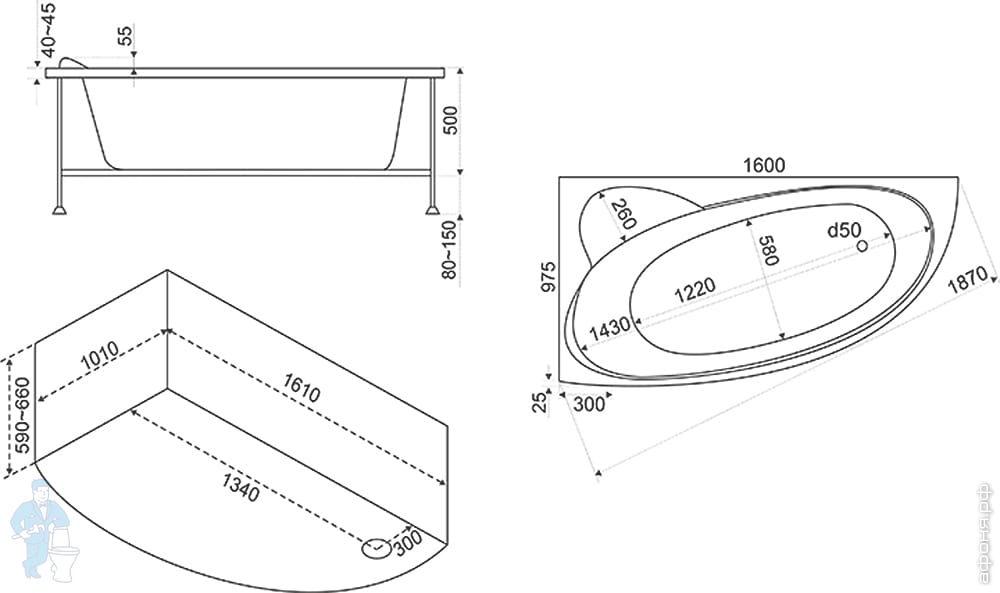 Ванна акриловая BAS Сагра 1600х1000 угловая, правая, асимметричная,каркас, без слива-перелива, белыйКод: 10132