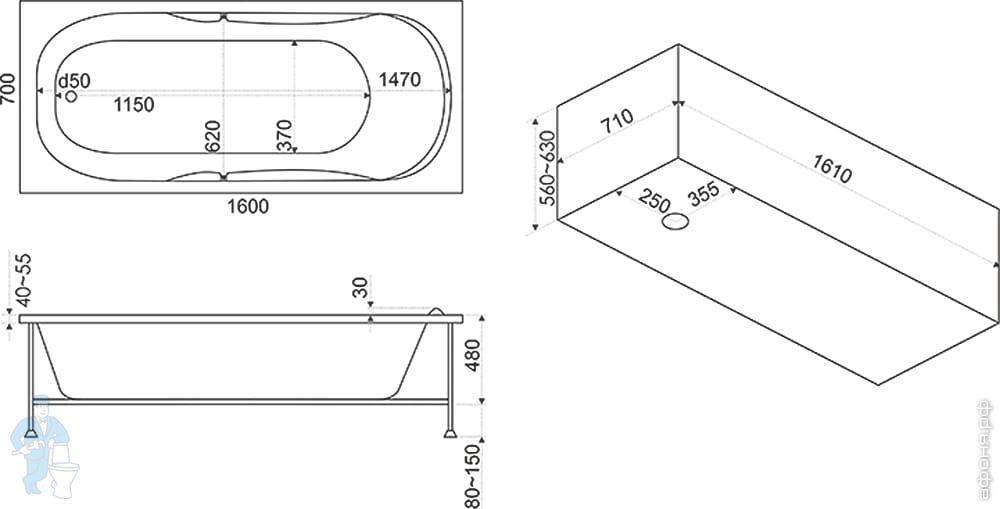Ванна акриловая BAS Мальдива 1600х700 прямоугольная, каркас, без слива-перелива, цвет: белыйт: белыйКод: 8517