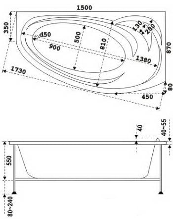 Ванна акриловая BAS Алегра 1500х900 угловая, левая, асимметричная, каркас, без слива-перелива, белыйКод: 10133