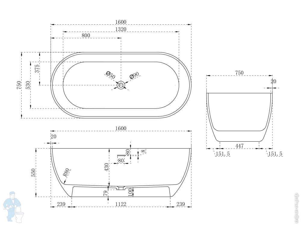 Ванна из исскуственного камня Abber Stein (1600x750) отдельностоящая, слив-пер, белая мат AS9613-1.6Код: 324739